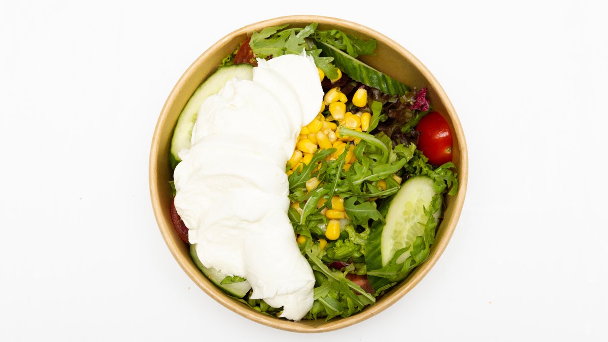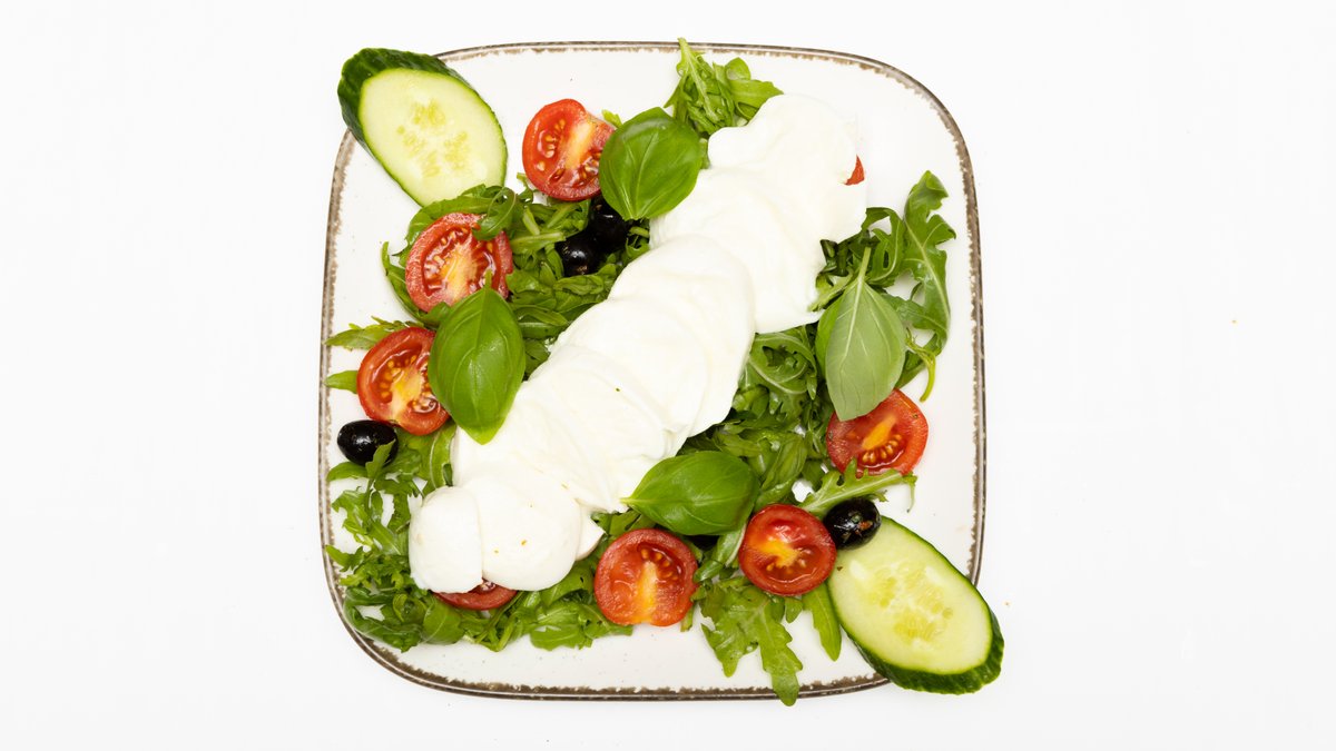 mit gemischtem Salat, Tomaten und Bufala-Mozzarella