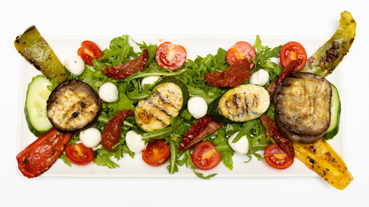 mit verschiedenen Gemüsesorten, Mozzarella, Oliven, Knoblauch, Petersilie, getrockneten Tomaten und Olivenöl