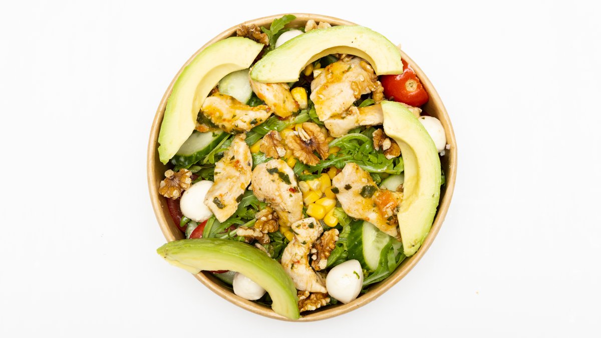 mit gemischtem Salat, Mozzarella, Rucola, gebratener Hühnchenbrust, Walnüssen und Avocado