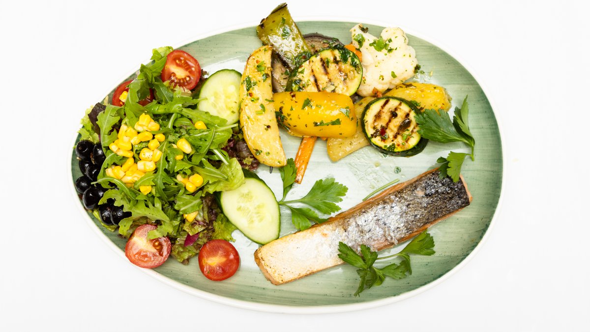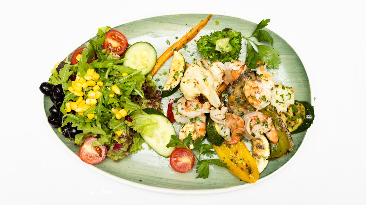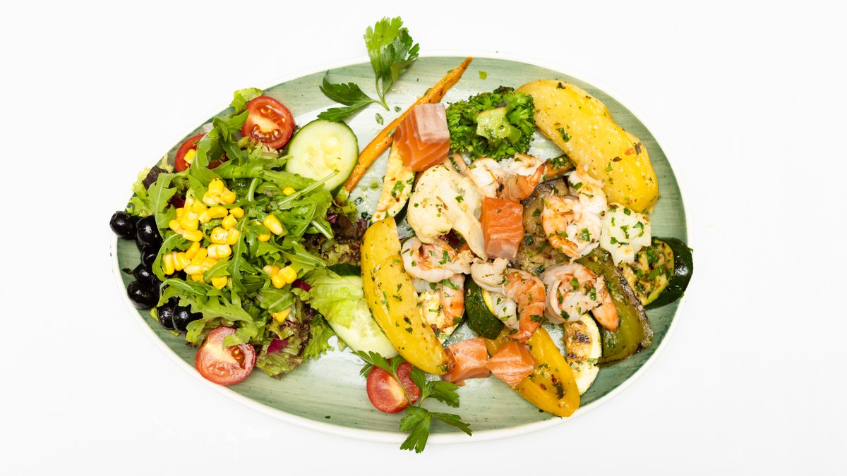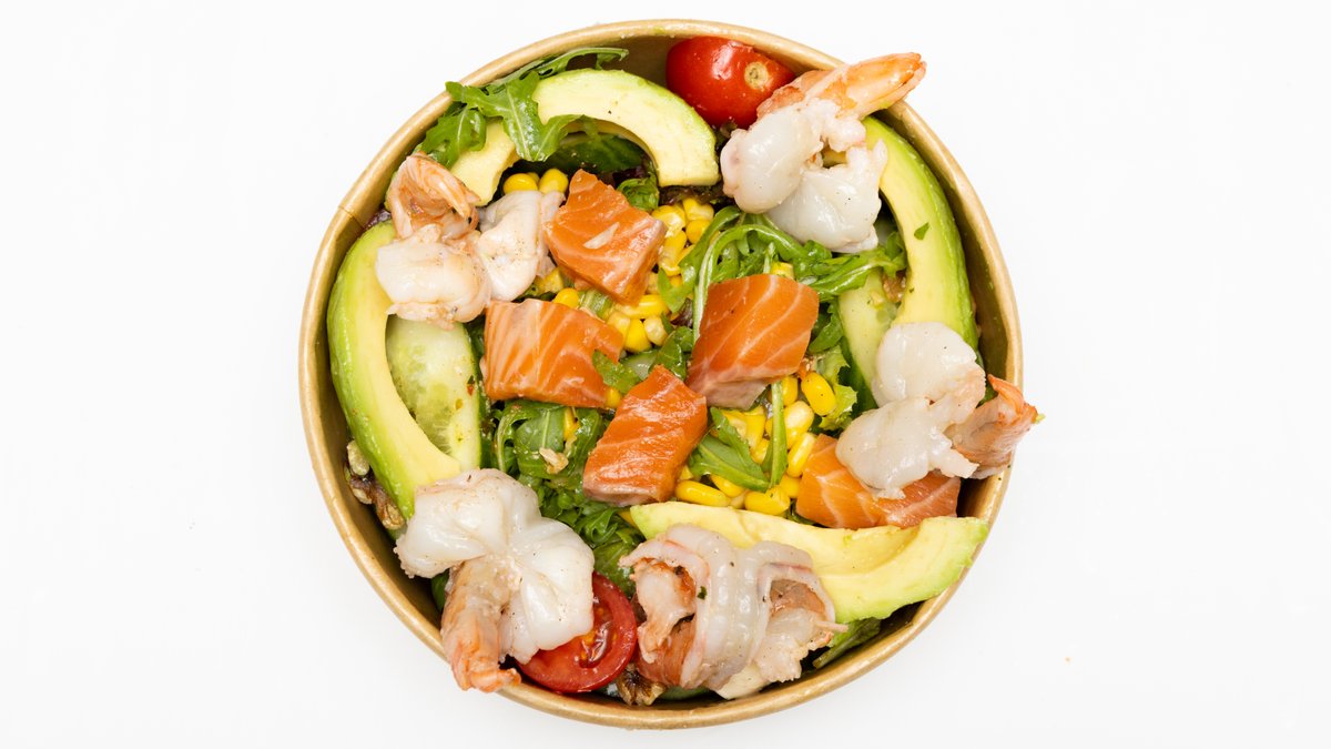 mit gemischtem Salat, Lachs, Scampi, Artischocken, Knoblauch und Avocado