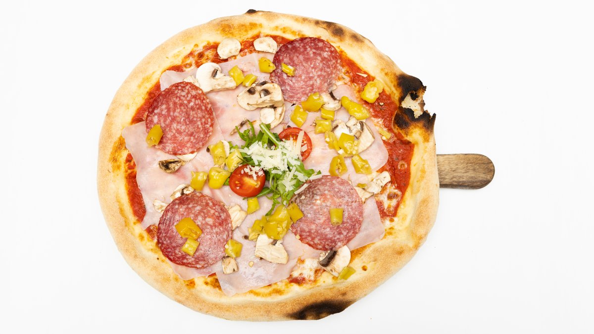 mit Mozzarella, Kochschinken, milder Salami, Champignons und Peperoni