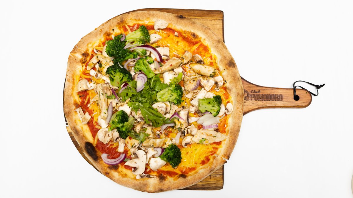 mit Mozzarella, Brokkoli, Hähnchen, Champignons und Zwiebeln