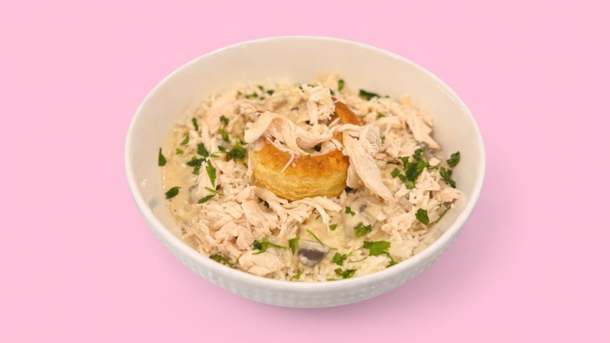 Blätterteigpastete gefüllt mit zartem Hühnchengeschnetzeltem in cremiger Champignonsoße • serviert mit leicht gebuttertem Lorbeerreis. puff pastry pie filled with tender chicken strips in a creamy mushroom sauce • served with lightly buttered bay leaf rice