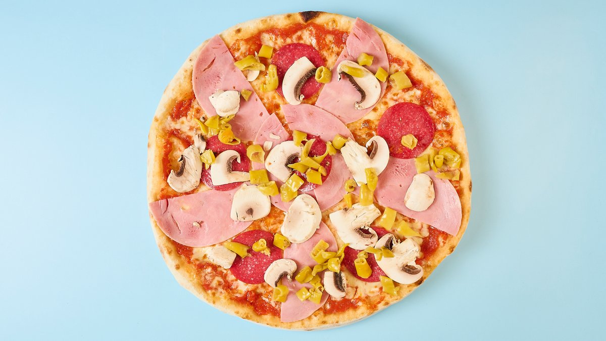 mit Salami vom Rind- und Putenfleisch, Champignons, Peperoni und Schinken vom Rind- und Putenfleisch