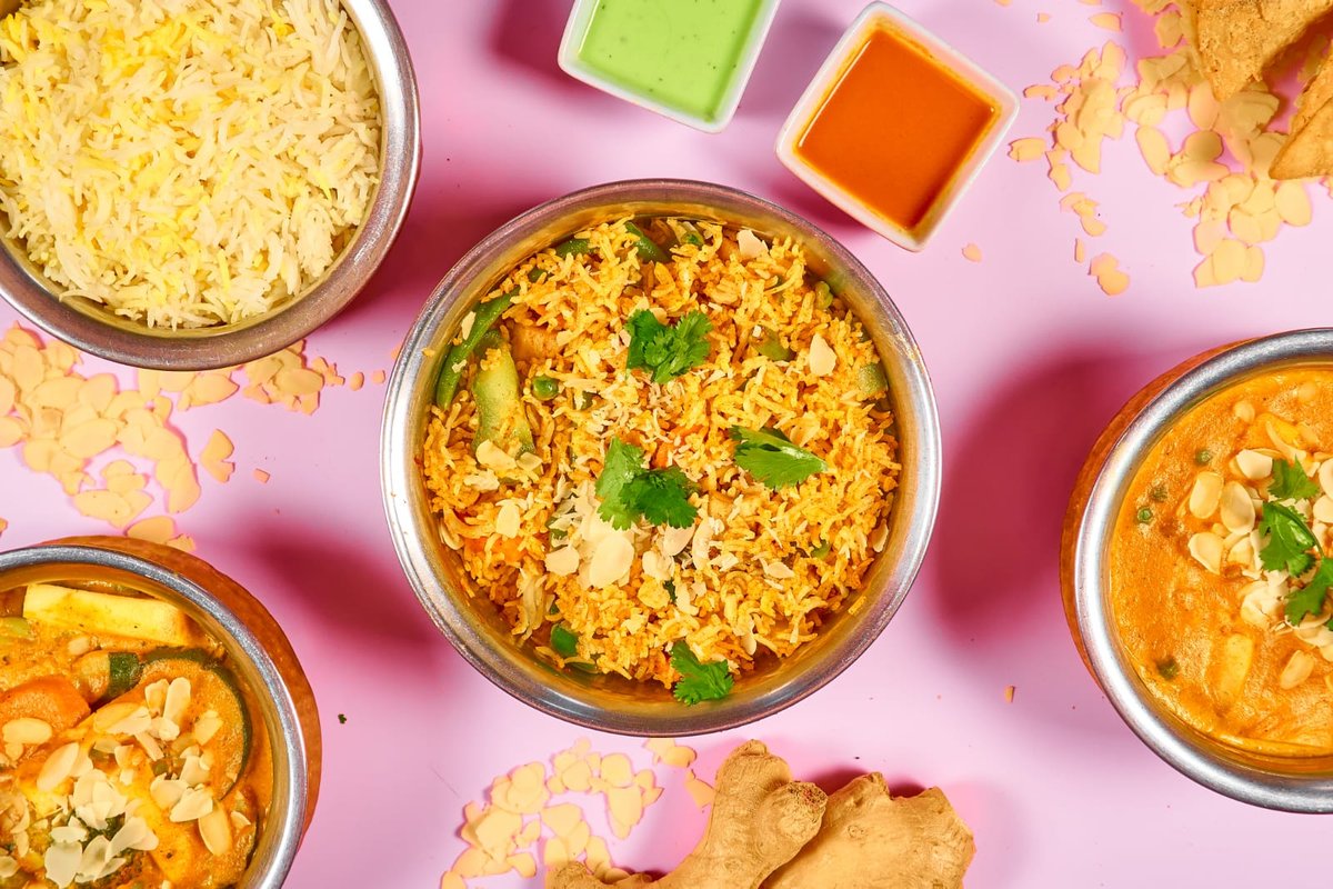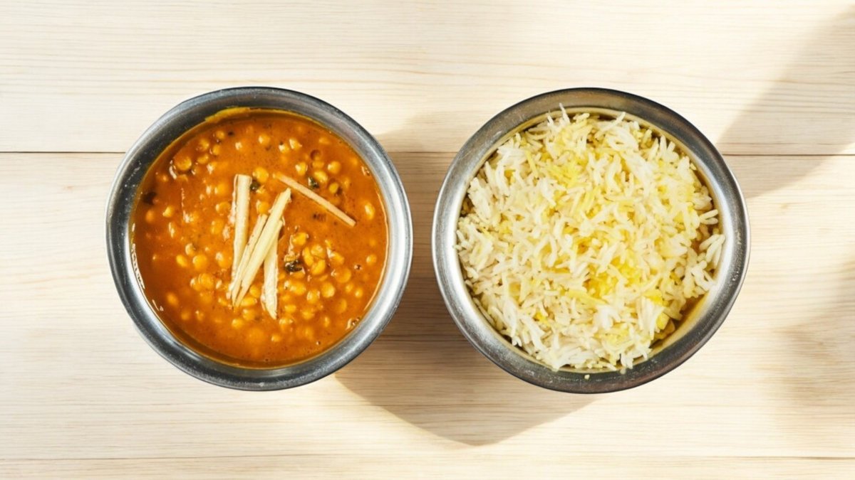 pikante Kichererbsen in Currysoße, dazu Reis und Salat