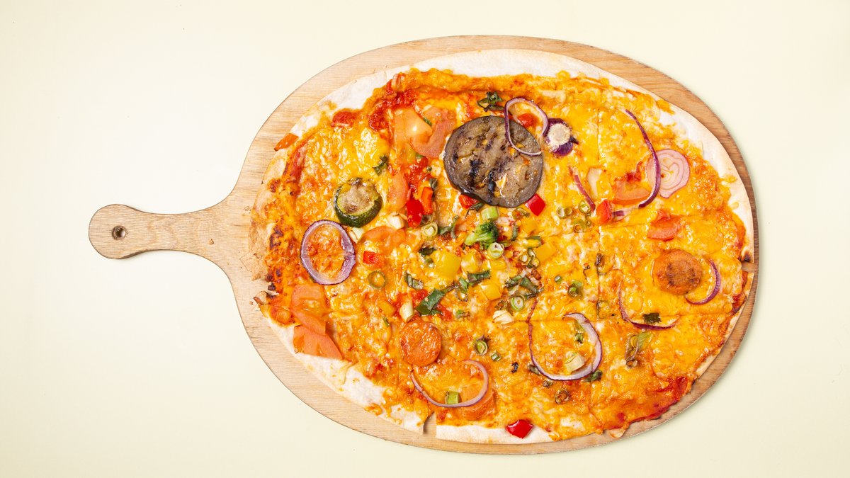 mit Tomatensoße, Mozzarella, Thunfisch und roten Zwiebeln