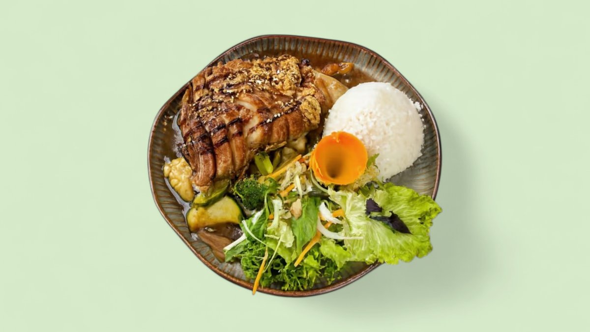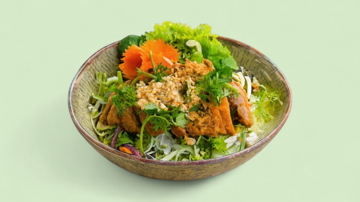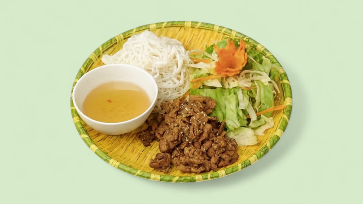 gegrilltes Schweinefleisch, serviert mit Salat, asiatischen Kräutern, hausgemachter Soße und Reisnudeln