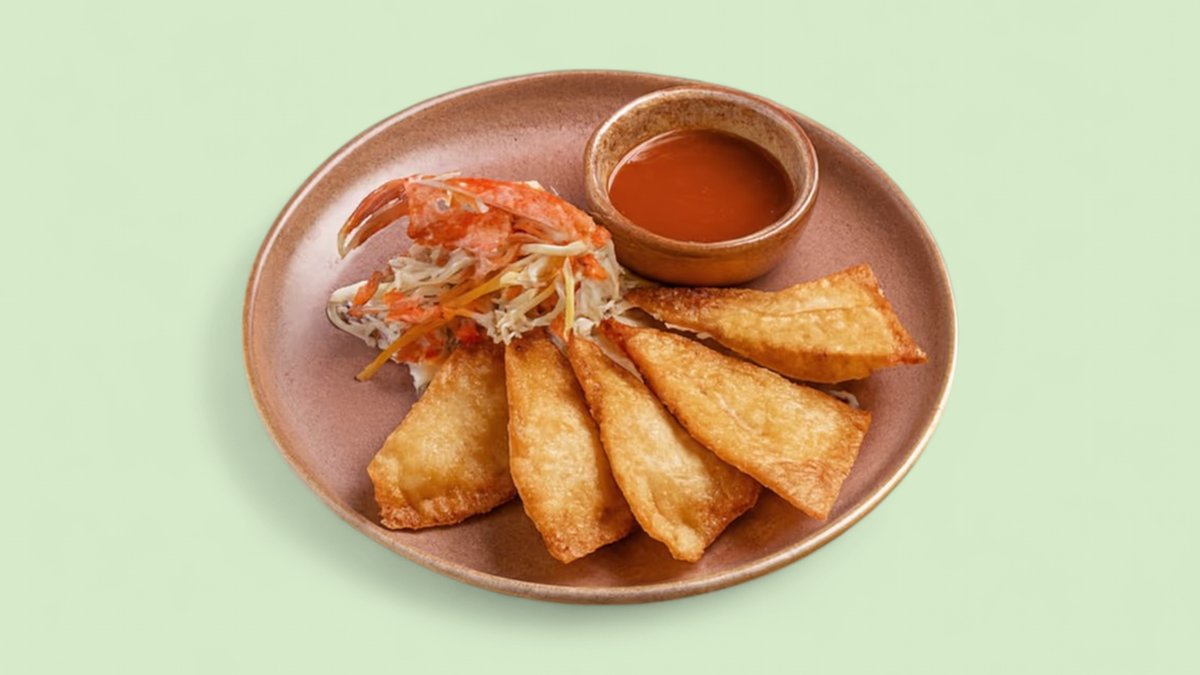 gebackener Wantanteig, gefüllt mit gehacktem Hähnchenfleisch und Garnelen, dazu Süß-Sauer-Soße