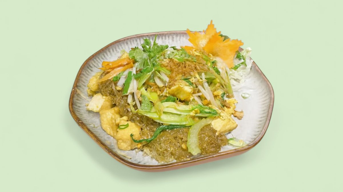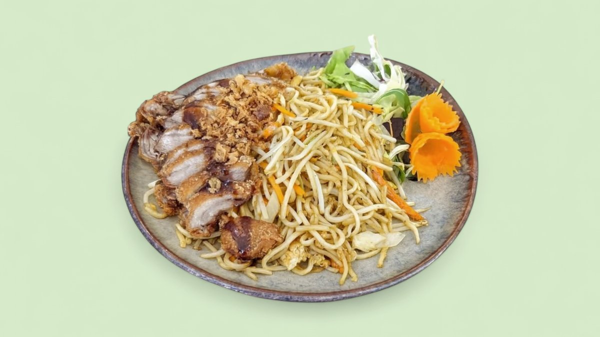 gebratene Udon-Nudeln mit saisonalem Gemüse, Ei, Röstzwiebeln und hausgemachter Soße