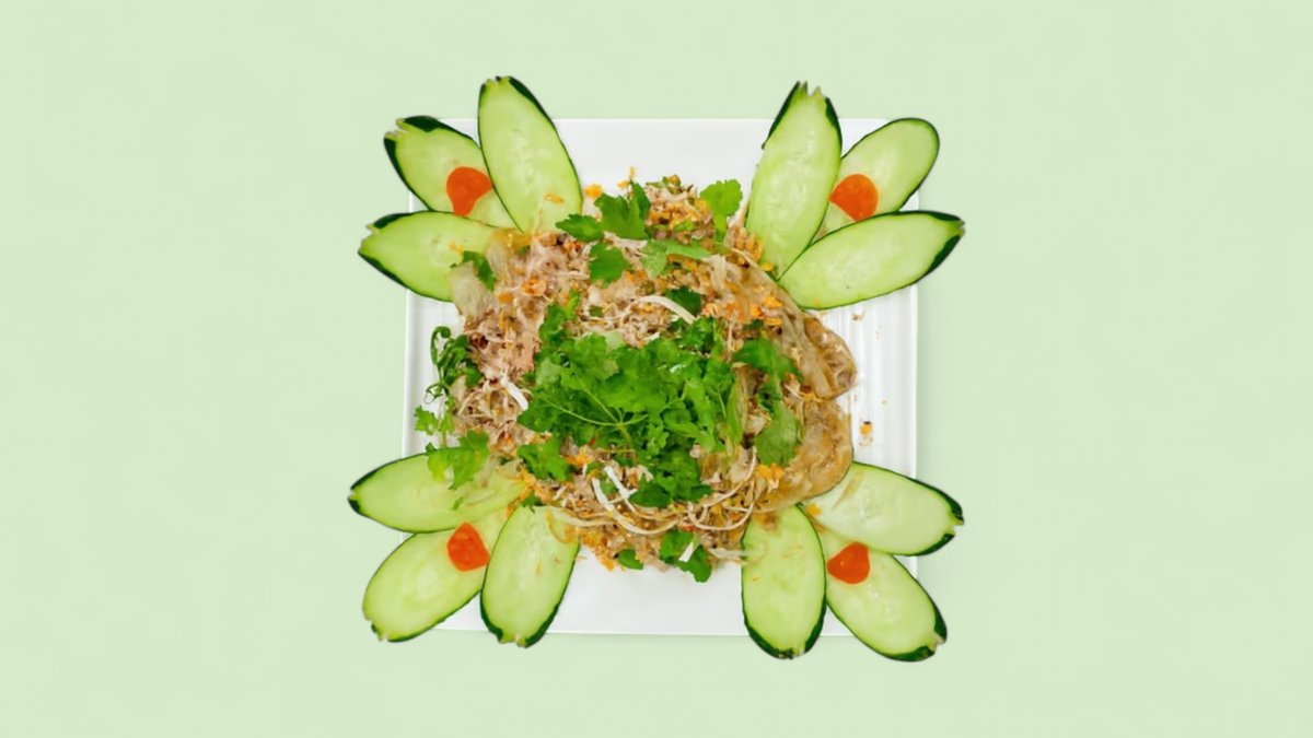 grüner Papayasalat mit Rindfleisch, Garnelen, Kräutern, Erdnüssen, gerösteten Zwiebeln und hausgemachter Soße