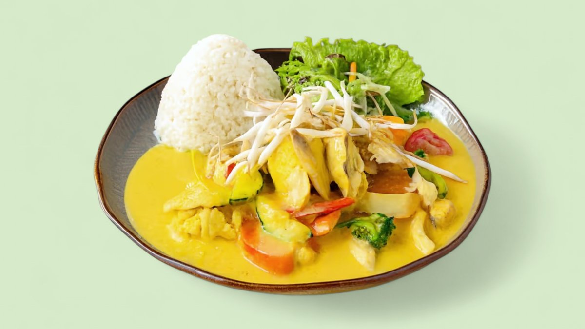 cremige Kokos-Curry-Soße mit marktfrischem Gemüse, Ananas, Kürbis, gerösteten Erdnüssen und Sesamreis