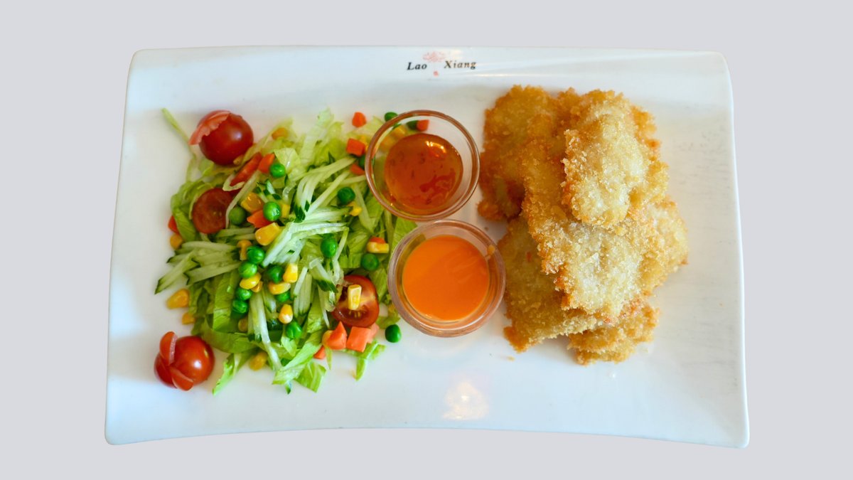 Knusprig gebackenes Fischfilet, serviert mit einer fruchtig-säuerlichen Pflaumensauce und frischem Gemüse.