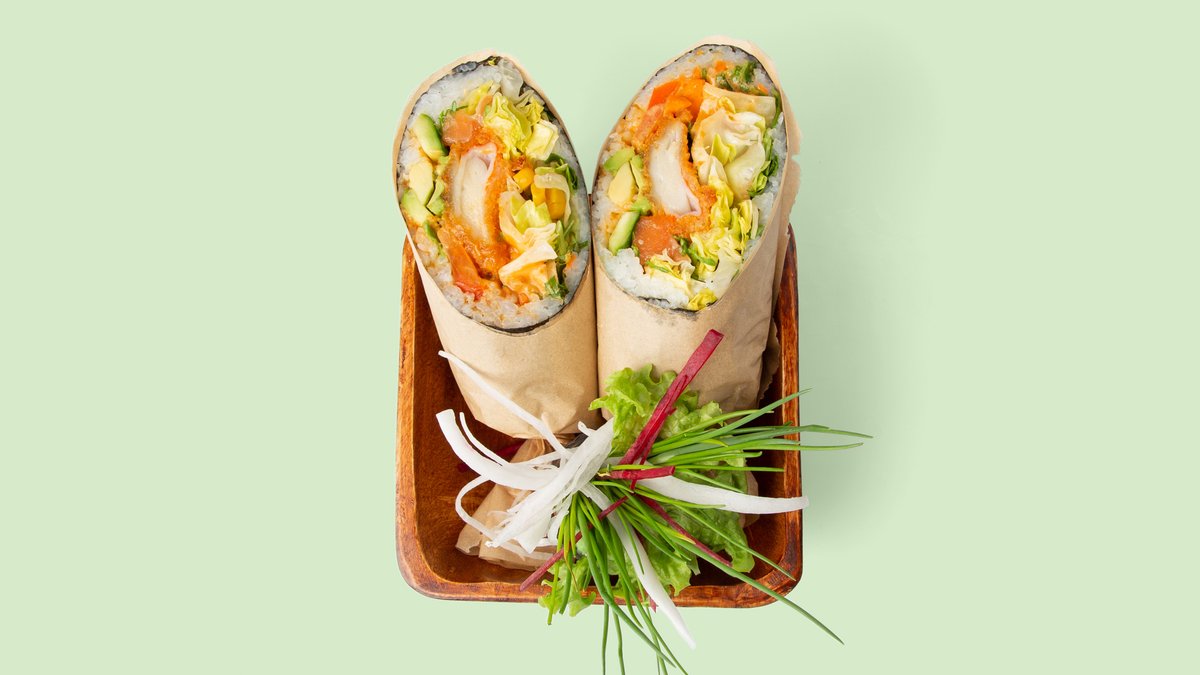 mit frittiertem Hähnchen, Frischkäse, Gurken, Sesam und Teriyaki-Soße