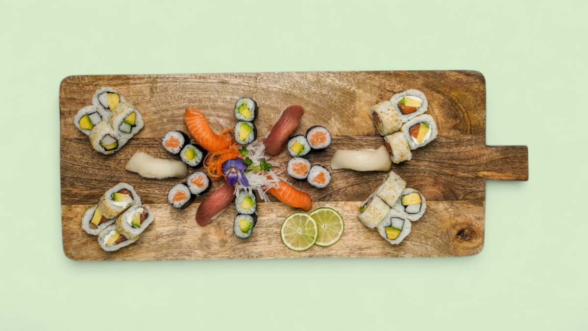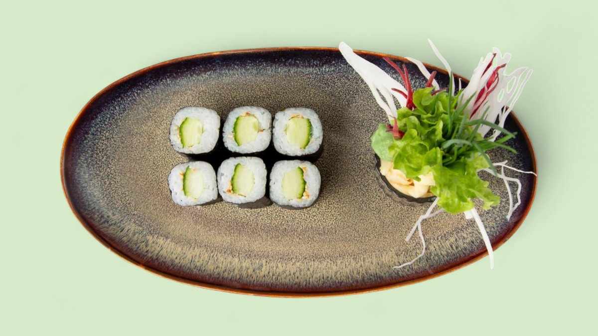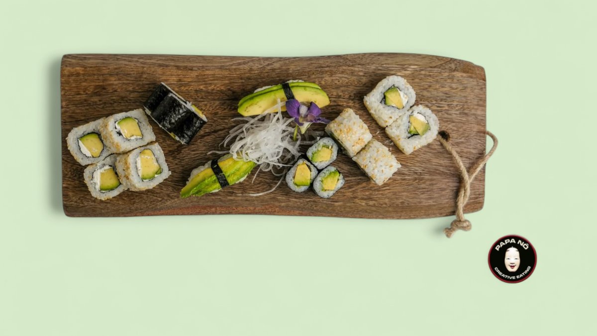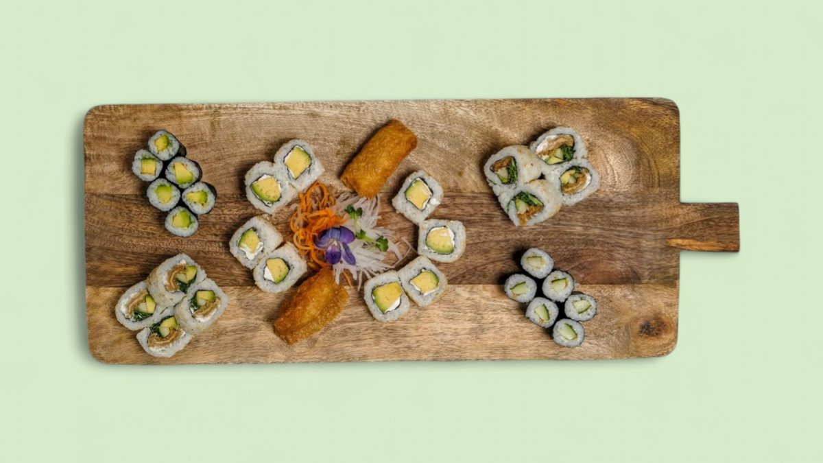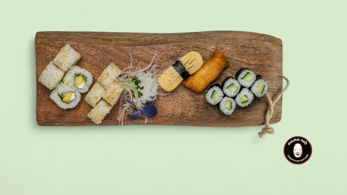 mit Gemüsetempura, Gurken, Frischkäse im Avocadomantel und Teriyaki-Soße