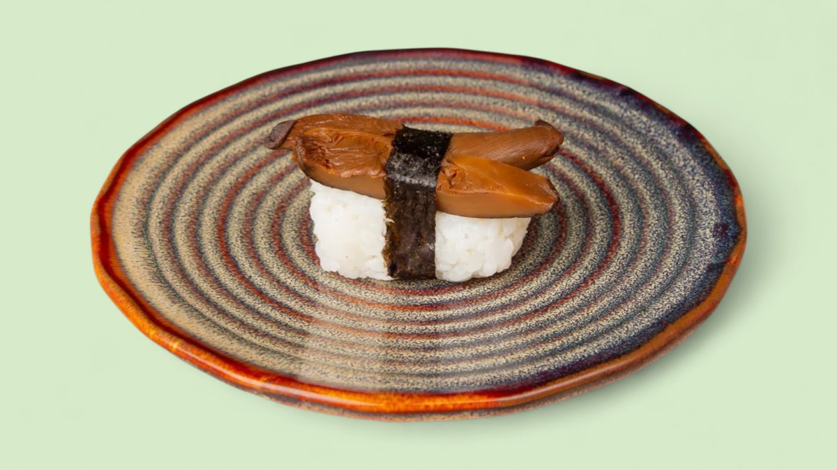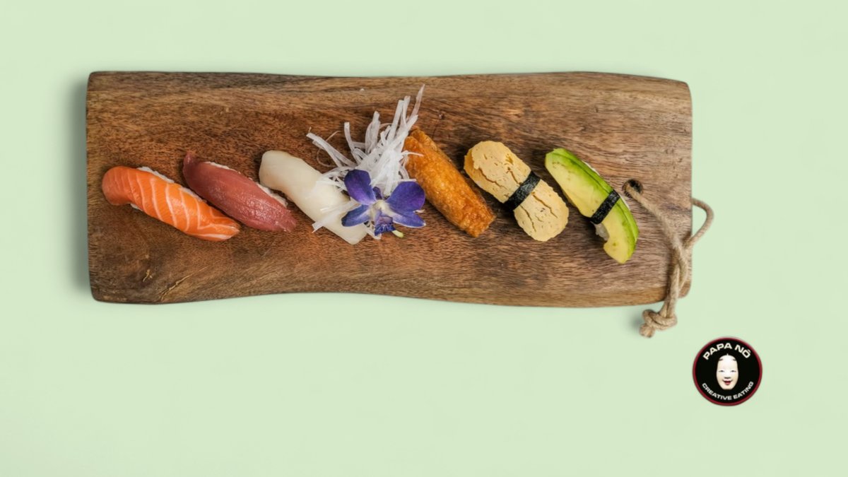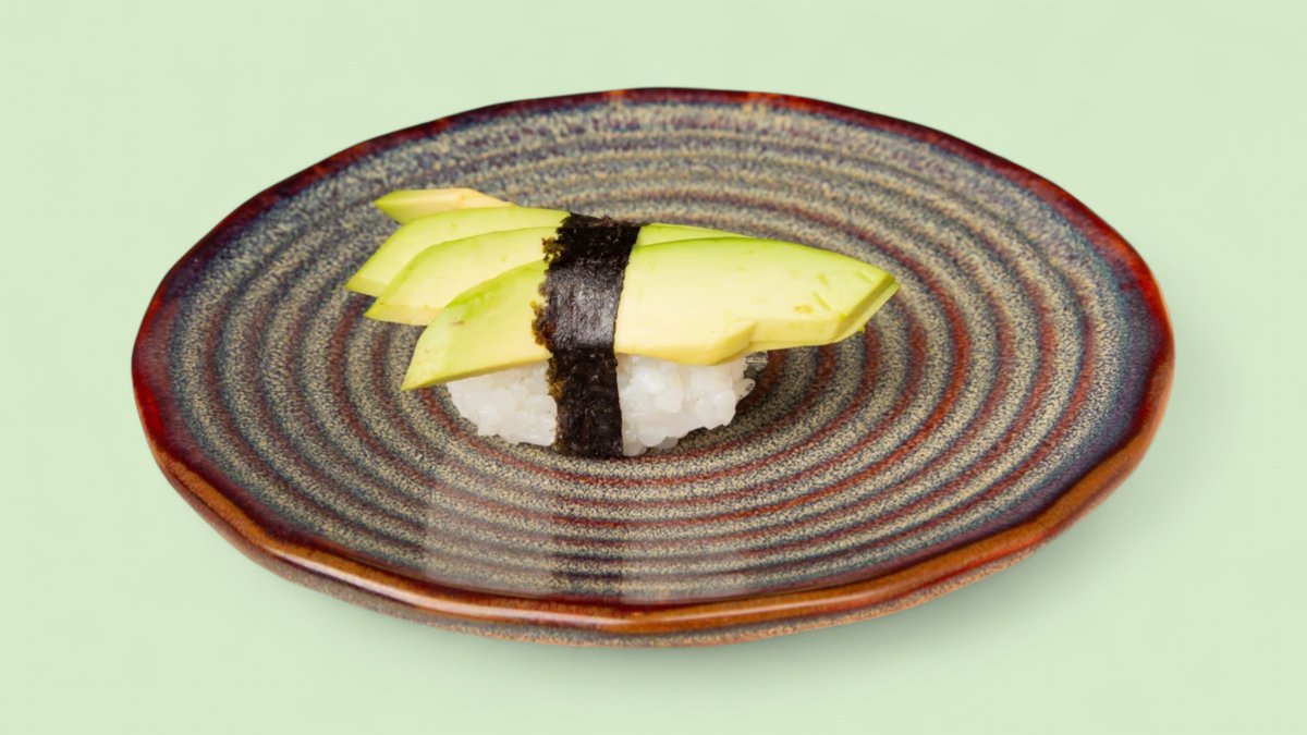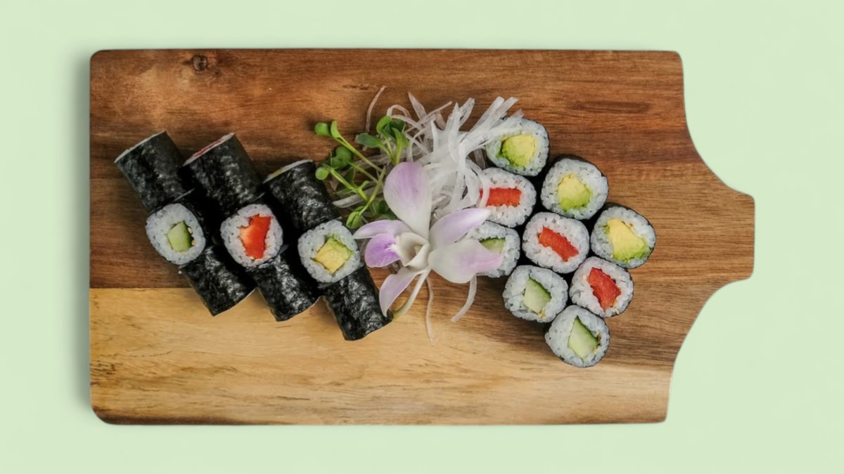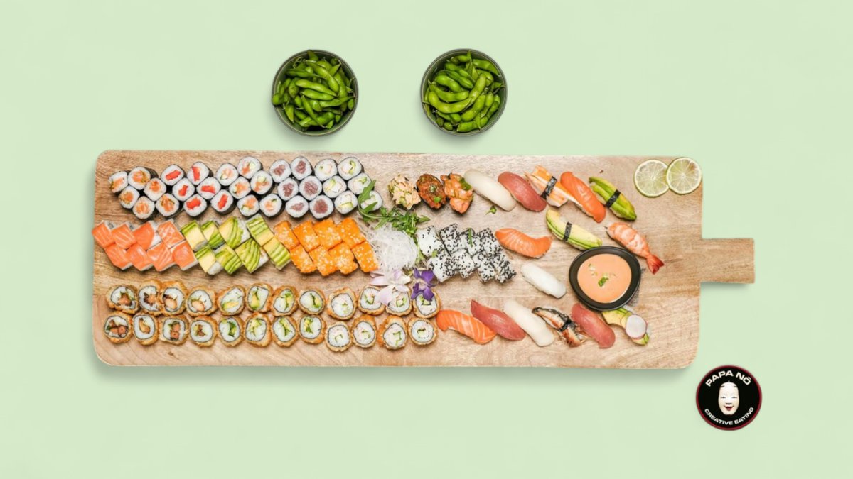 mit Gemüsetempura, Gurken, Frischkäse im Avocadomantel und Teriyaki-Soße