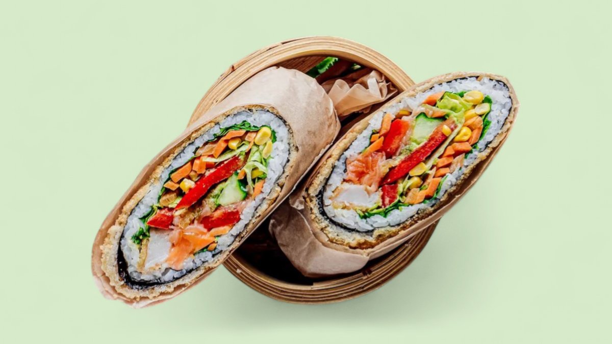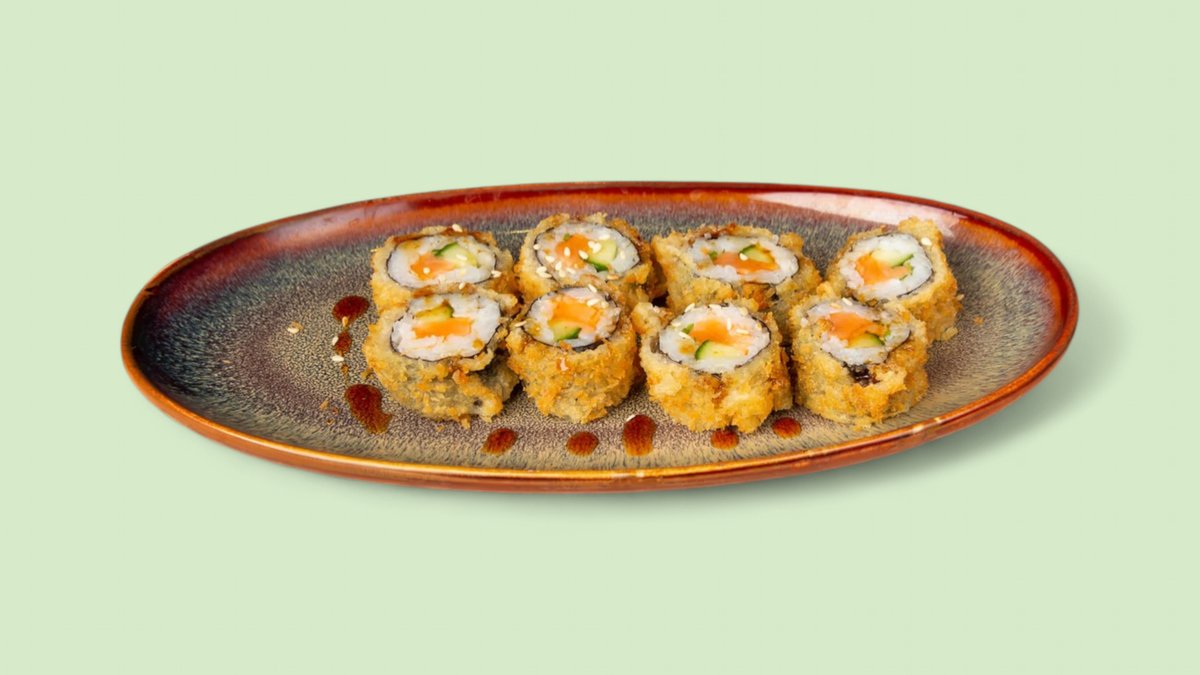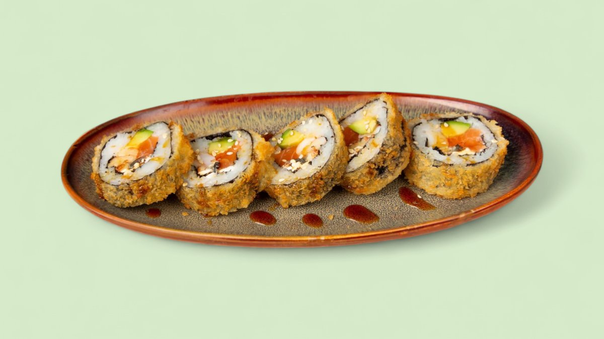 mit Aal, Lachs, Garnelen und Avocado, knusprig frittiert