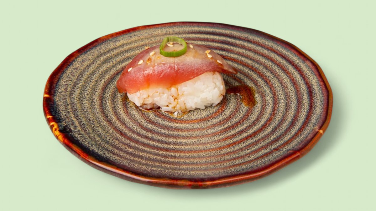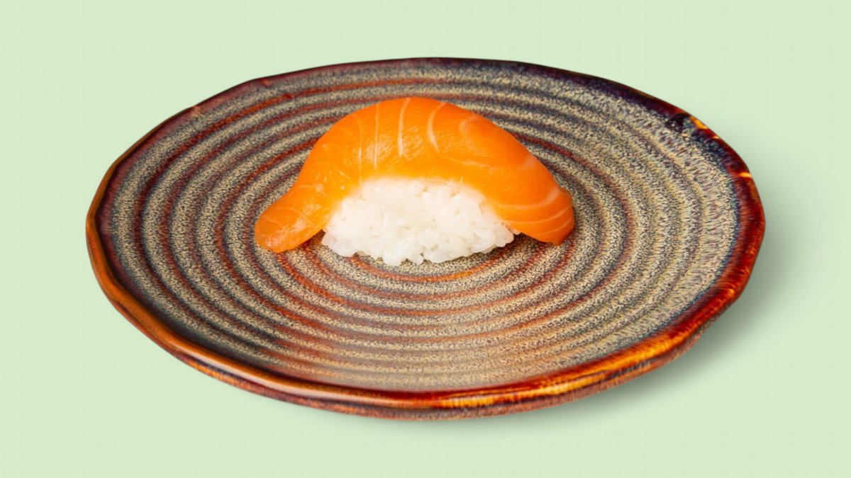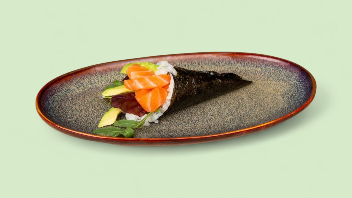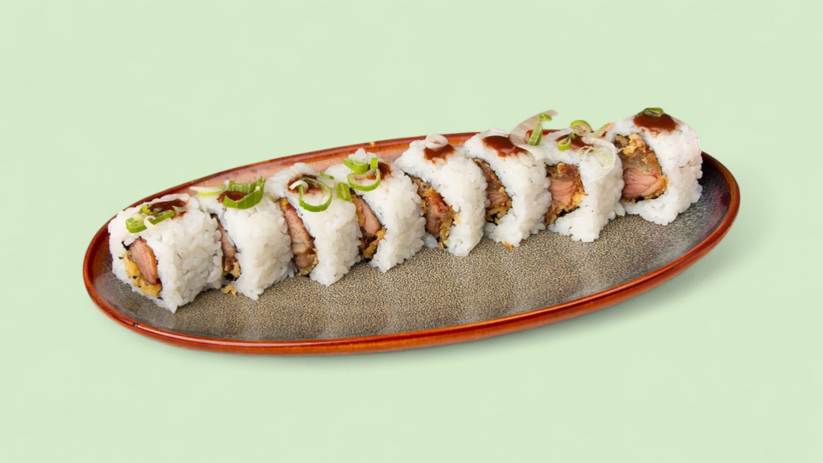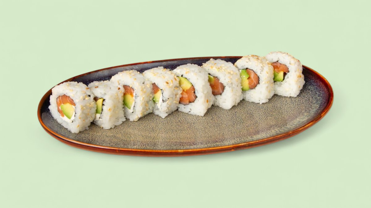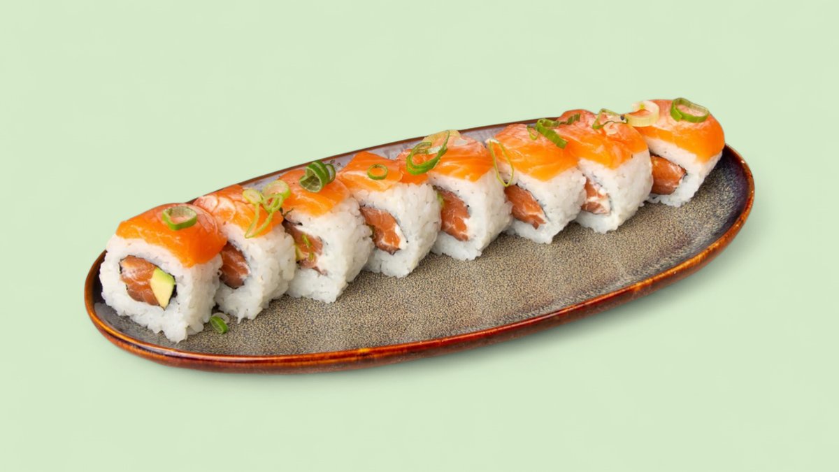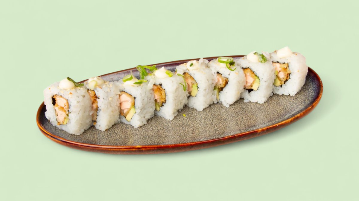 mit Lachstempura, Avocado, Mayonnaise, Lauch, Sesam und Teriyaki-Soße