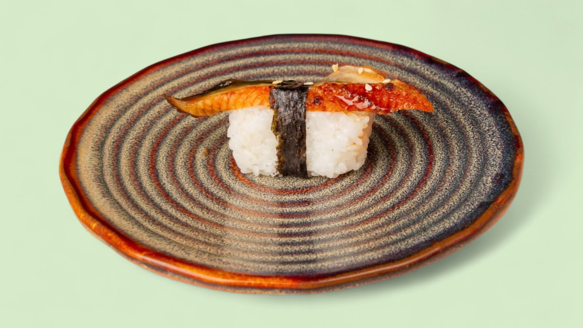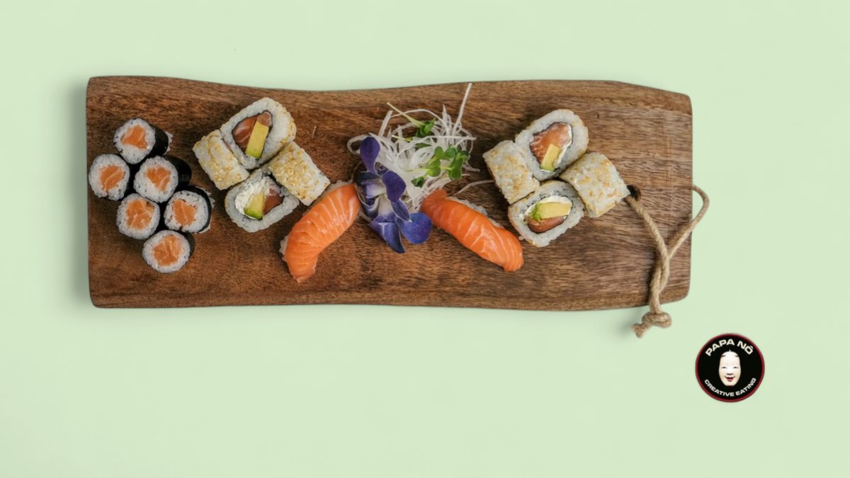 mit Gurken, Sußwasseraal, Garnelen, Lachs, Teriyakisoße und Sesam