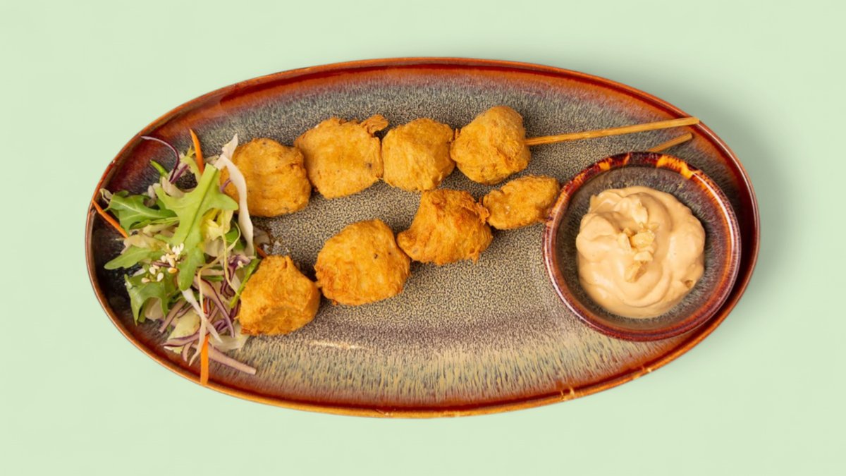 2 Stück aus Sojafleisch geformte und marinierte Sate-Spieße, dazu Erdnuss-Chilisoße