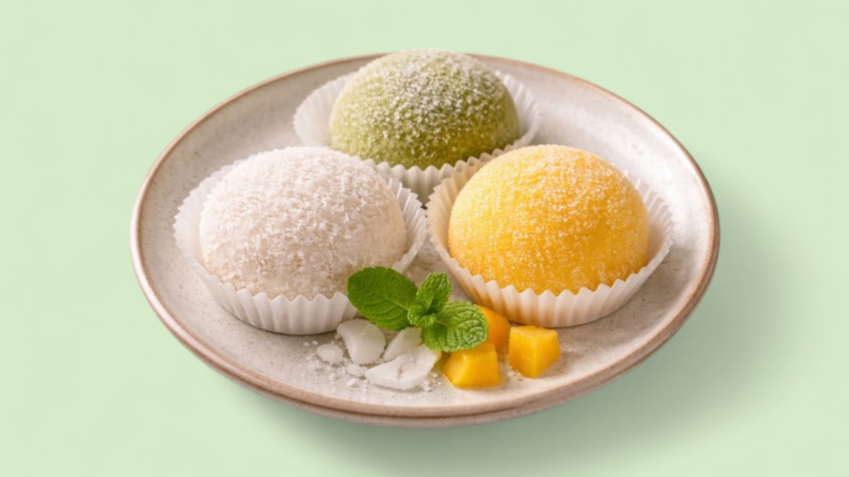 3 Stück japanische Reiskuchen aus Klebreis, mit Mango, Matcha, Kokos