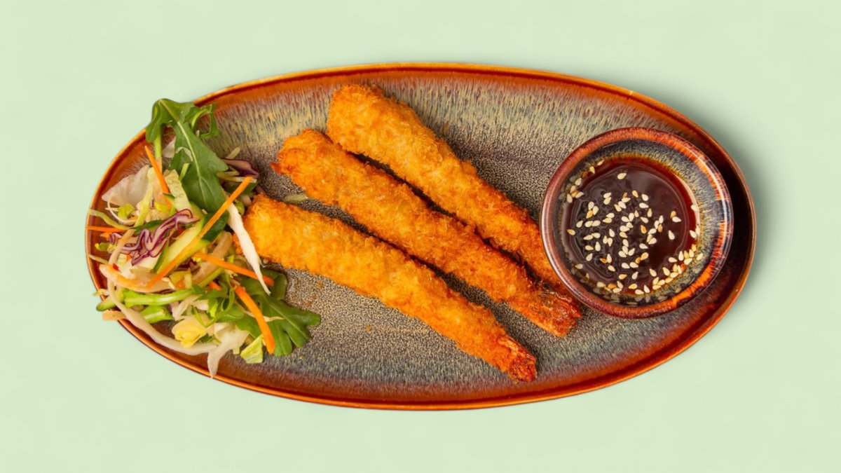 3 Stück im Tempurateig frittierte Garnelen mit Teriyaki-Soße und Sesam