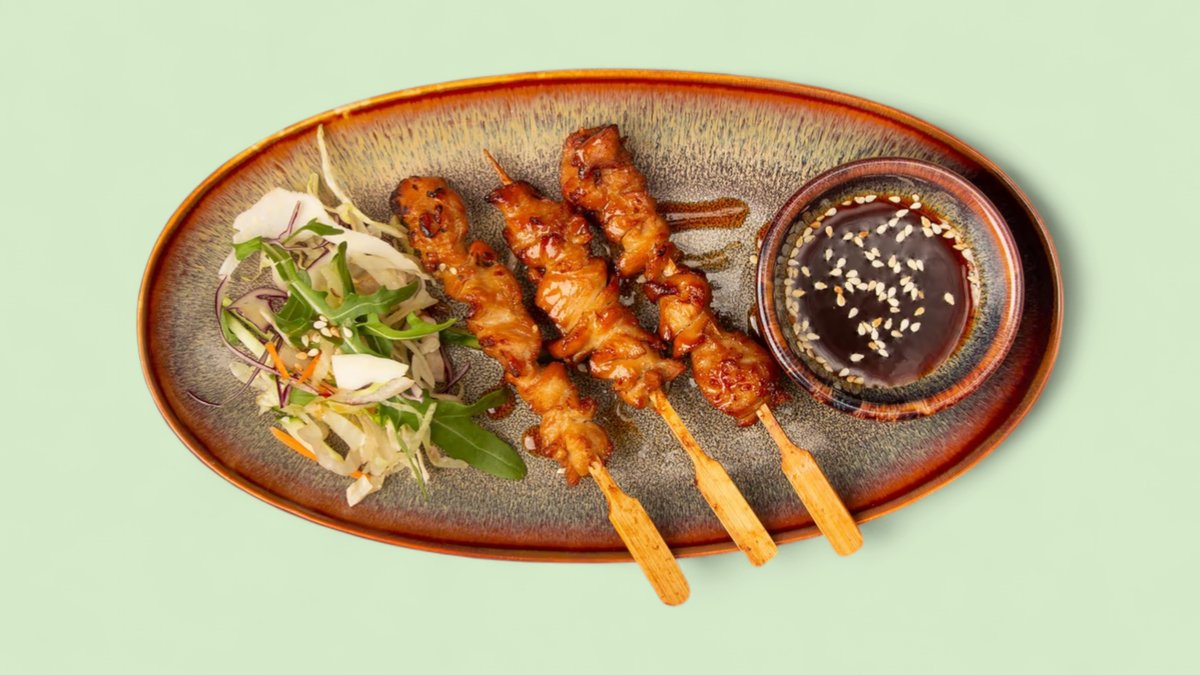 3 Stück marinierte Hähnchenbrustspieße, dazu Teriyaki-Soße und Sesam