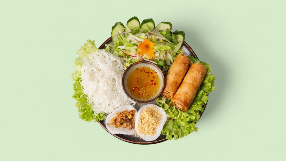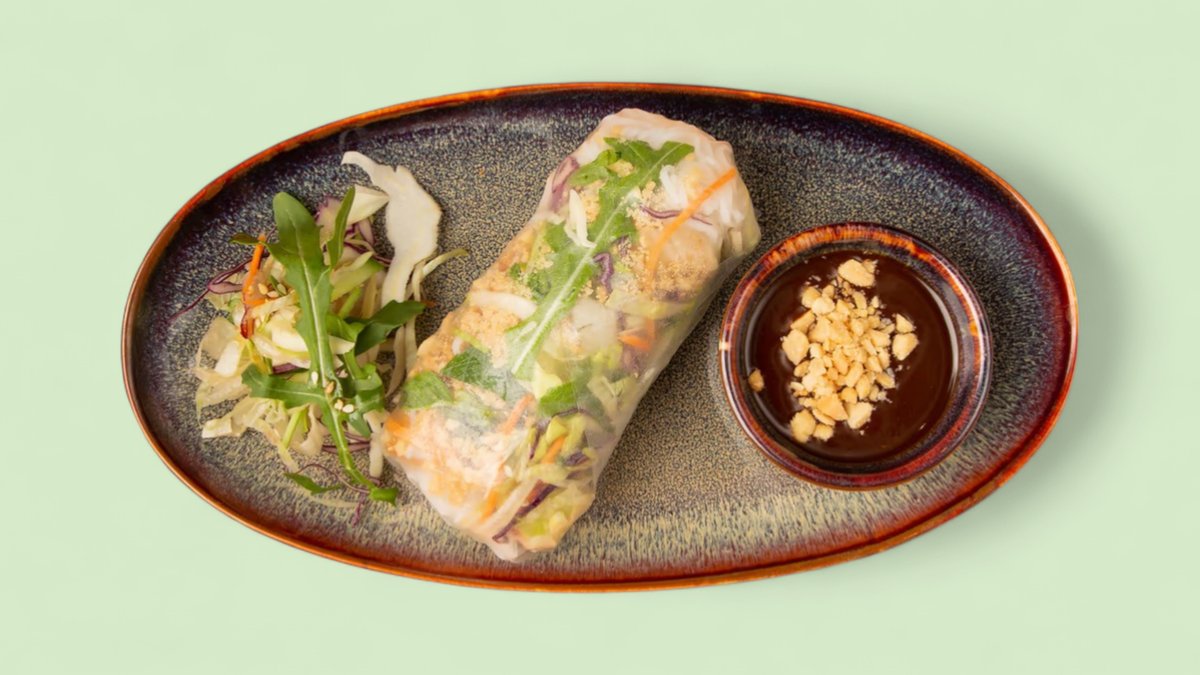 1 Stück Reispapierrolle gefüllt mit Reisnudeln, frischem Salat, Kräutern, Erdnüssen, Röstzwiebeln, Sesam und Hoisin-Soße