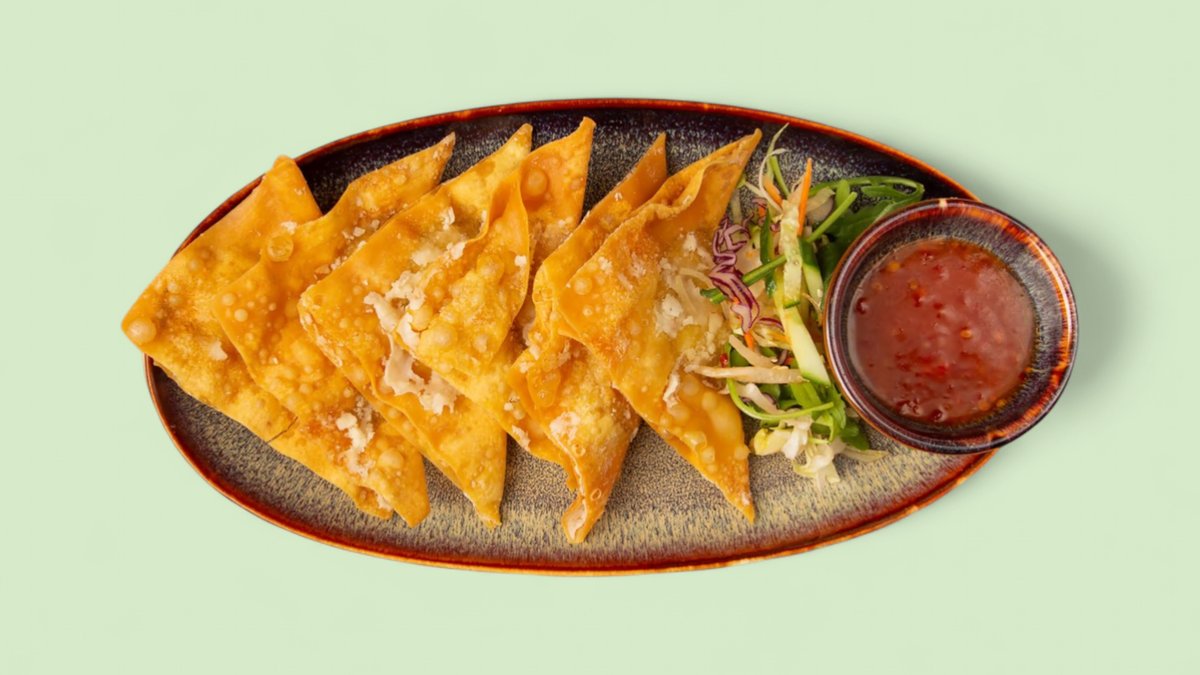 6 Stück gebackene Teigtaschen gefüllt mit gehackten Garnelen und Hähnchen, dazu süße Chilisoße