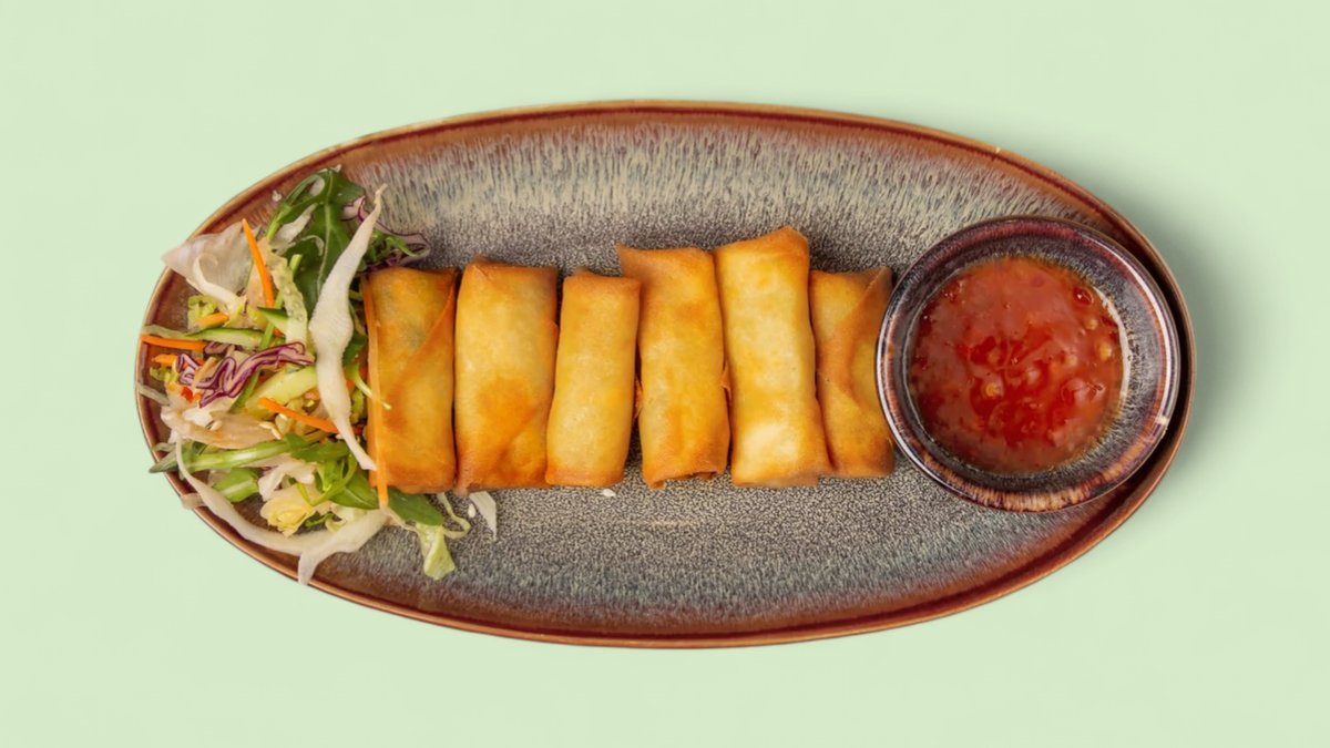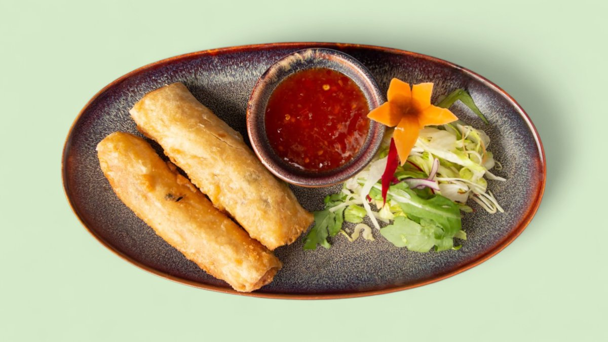 2 Stück hausgemachte Frühlingsrollen mit Gemüsefüllung, dazu suße Chilisoße