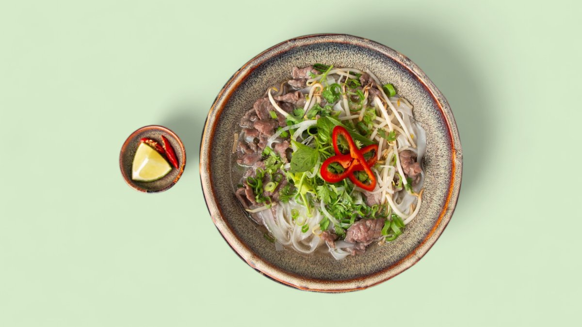 große Schale vietnamesische Bandnudelsuppe mit Sternanis gekochter Hähnchenbrühe, Sojasprossen und einer Zutat deiner Wahl