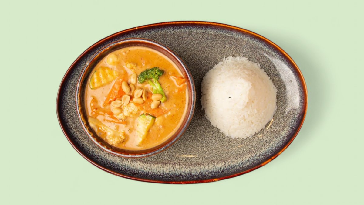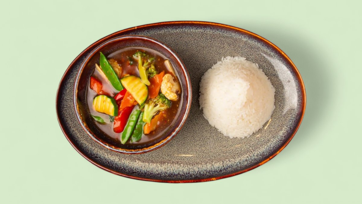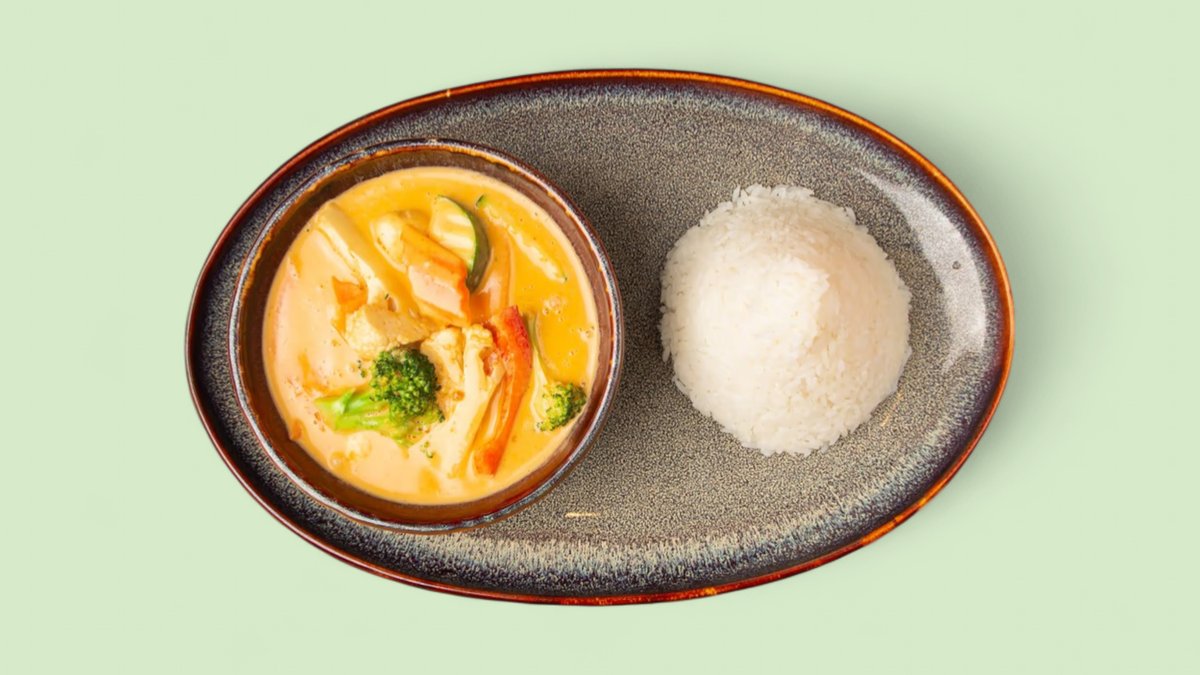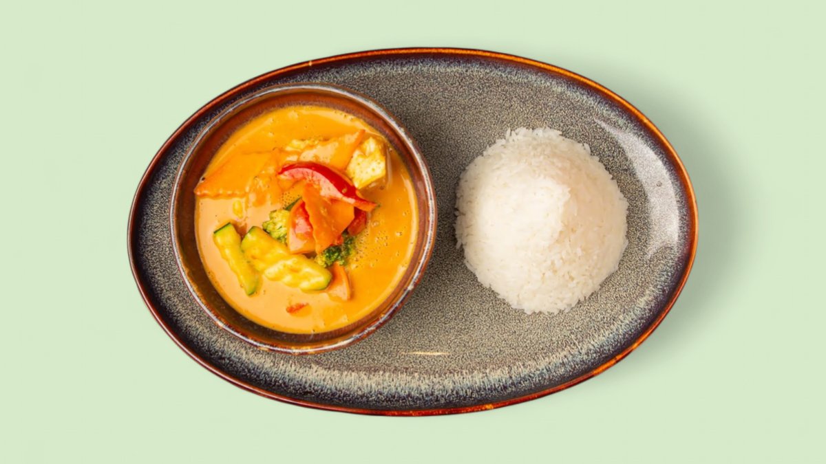 scharf frisches Wok-Gemüse in schmackhafter Curry-Kokosmilchsoße, Thai-Basilikum und Duftreis