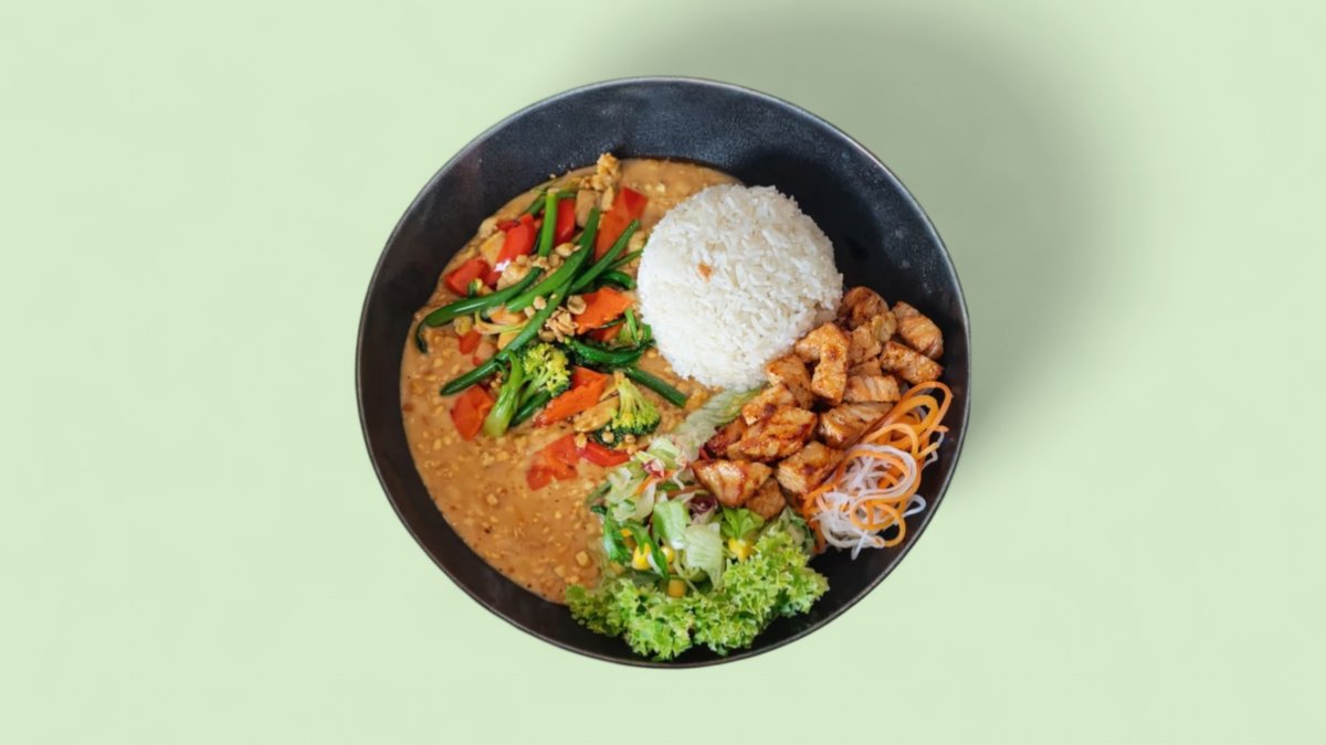 leicht scharf Duftreis mit pikanter Erdnuss-Kokosmilchsoße und Wok-Gemüse
