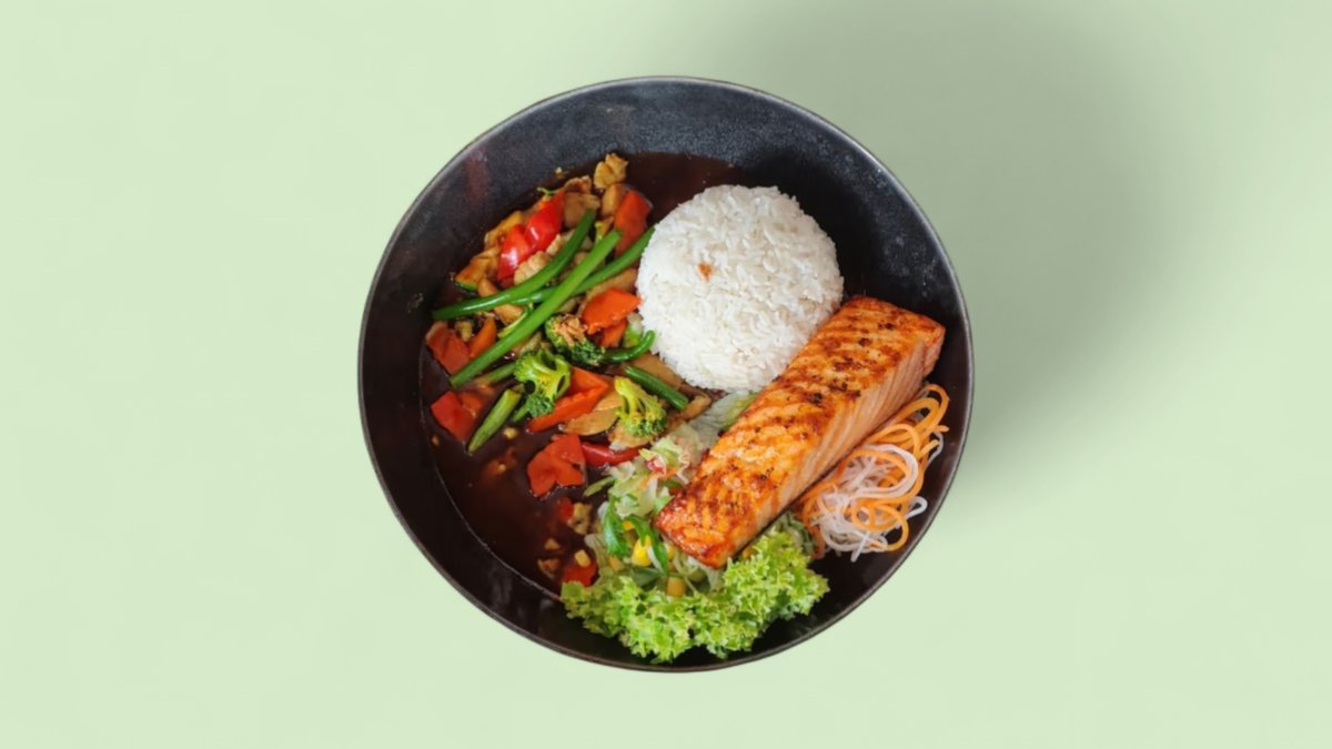 leicht scharf Duftreis mit scharfer Hoisin-Soße, Wok-Gemüse und Thai-Basilikum