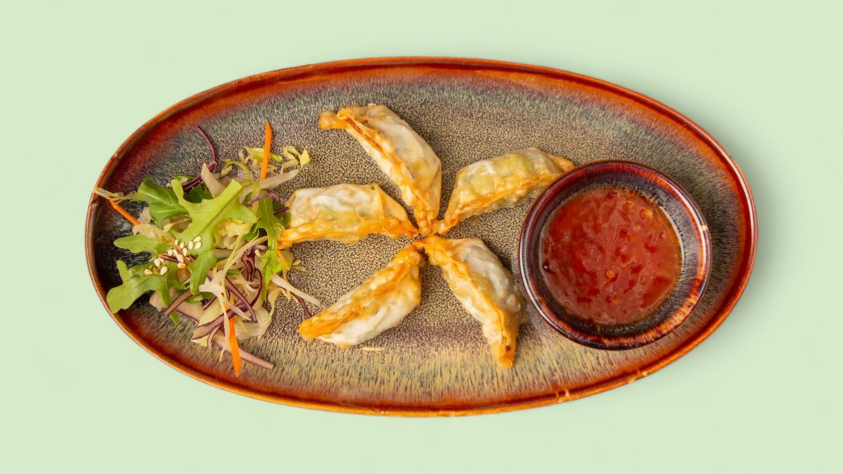 6 Stück knusprige Teigtaschen mit Spinat-Ingwer-Fullung und Erdnuss-Chilisoße