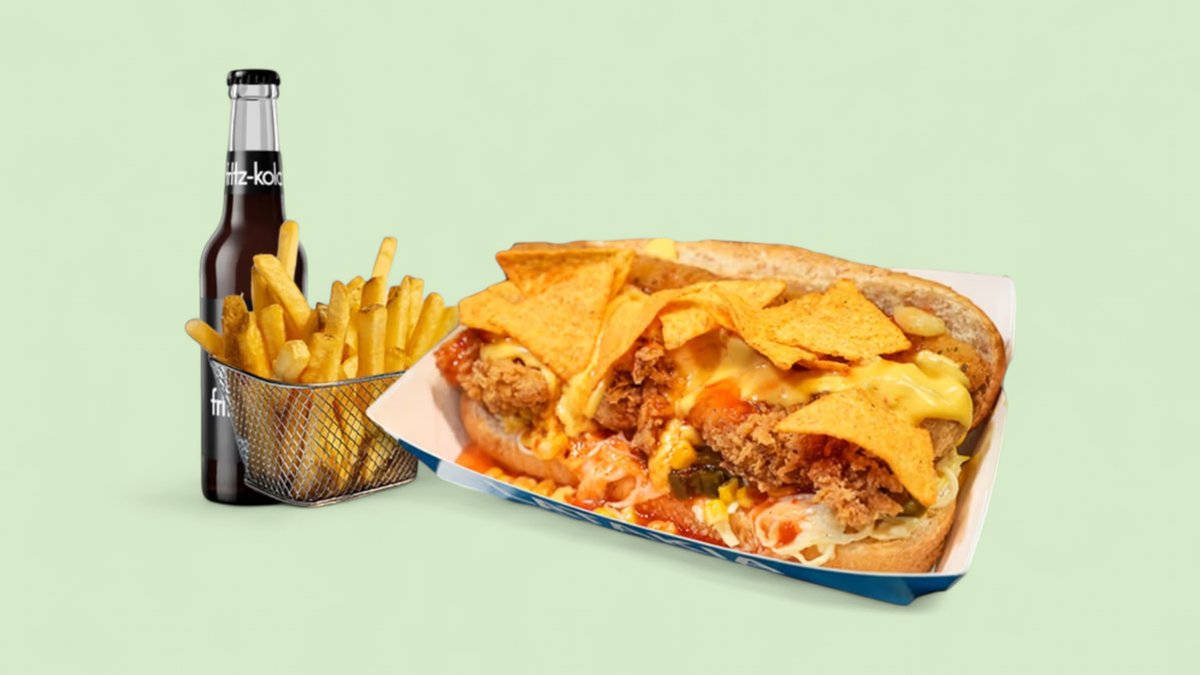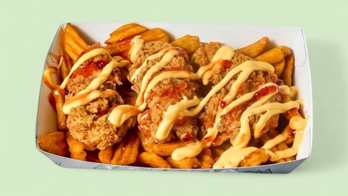 mit XL Pommes frites, Crispy Chicken Tender, Cheddar-Soße und Sweet Chili Sauce