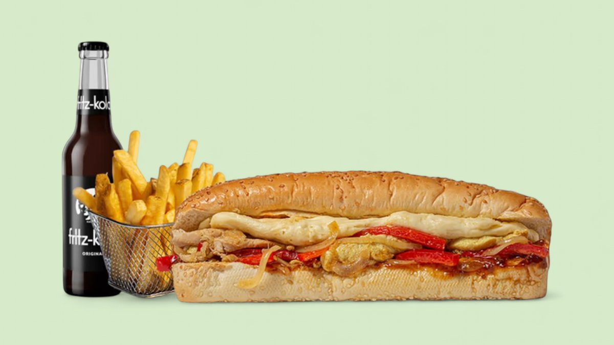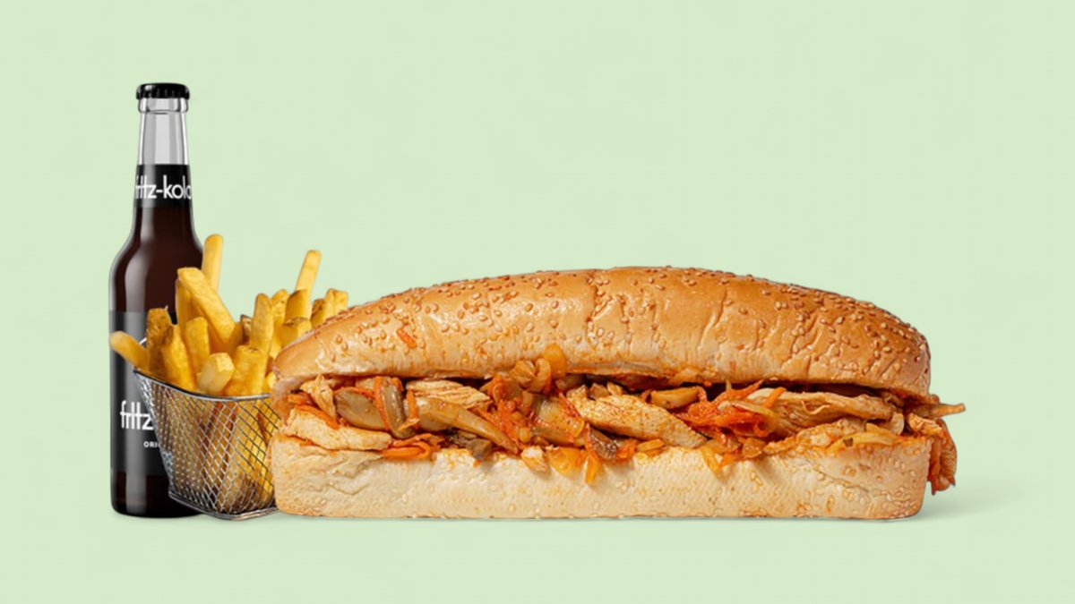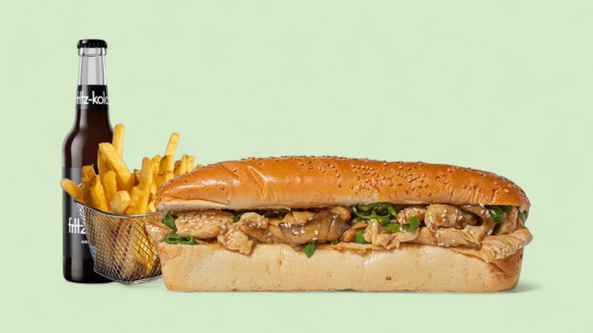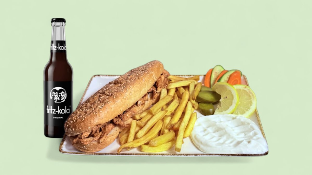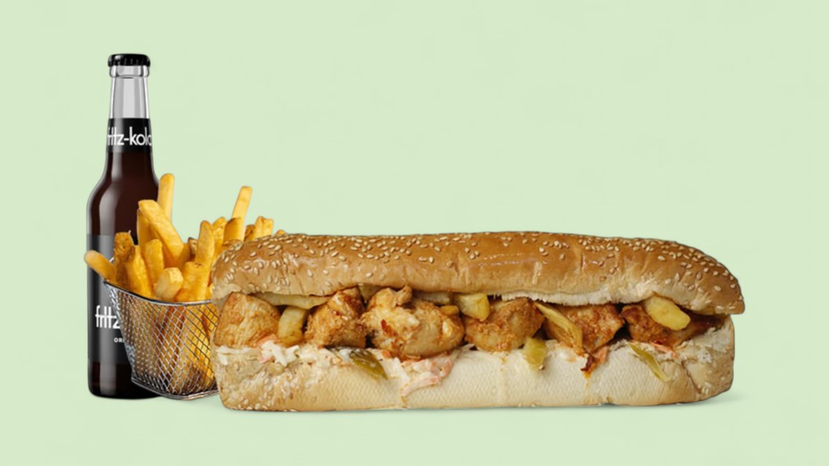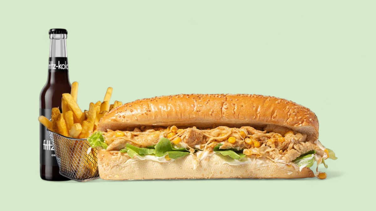 mit marinierten Hähnchenbruststücken, Mais, Käse, Eisbergsalat und Mayonnaise. Es wird mit Pommes Frites und ein Getränk serviert.