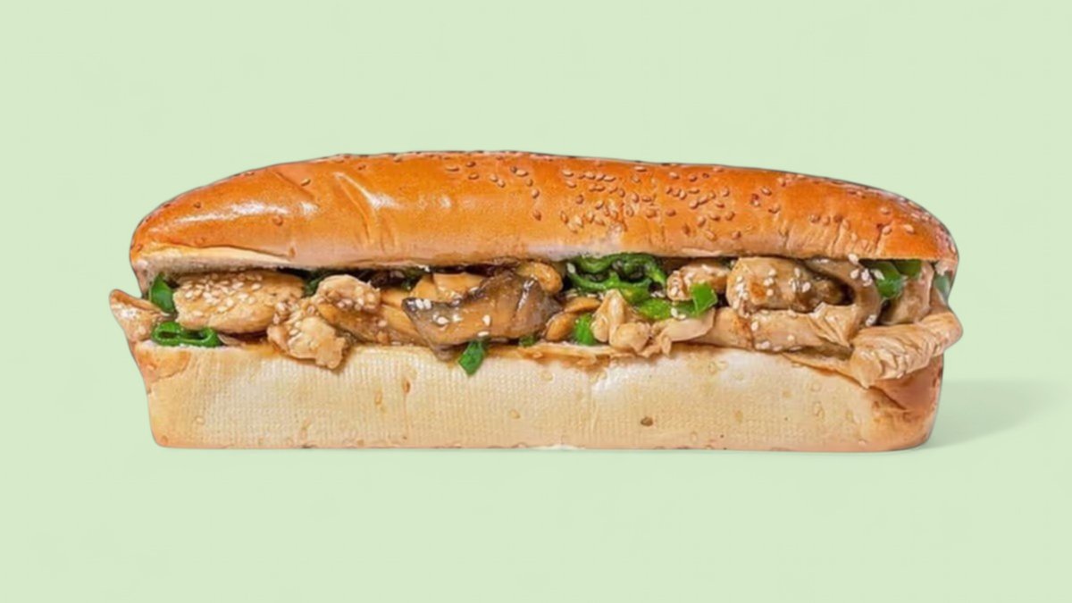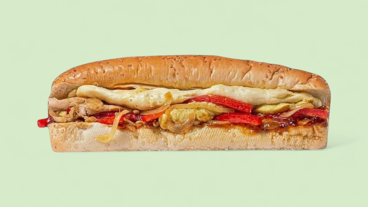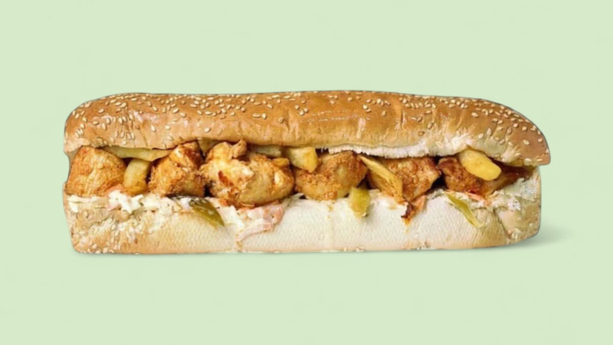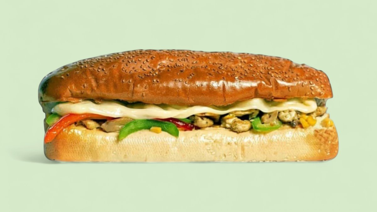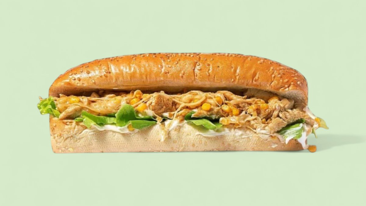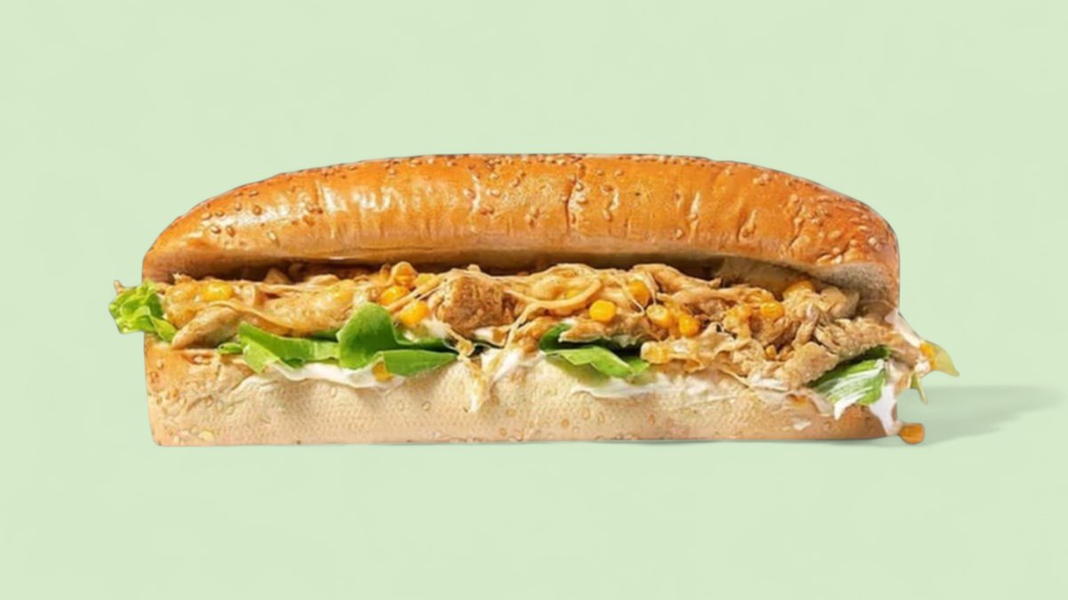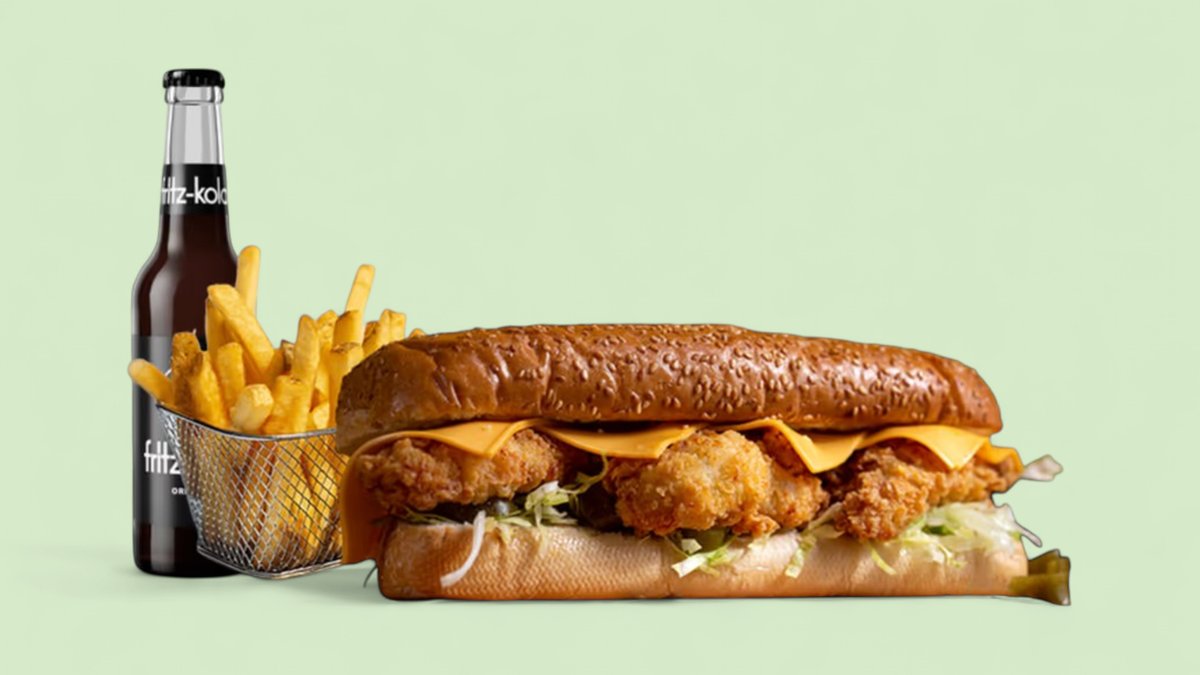 mit marinierten Hähnchenbruststücken, Mais, Käse, Eisbergsalat und Mayonnaise. Es wird mit Pommes Frites und ein Getränk serviert.
