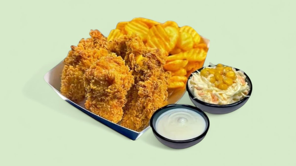mit frittierten Crispy Chicken Tenders, Kartoffeln, Coleslaw, Knoblauchsoße und Ketchup