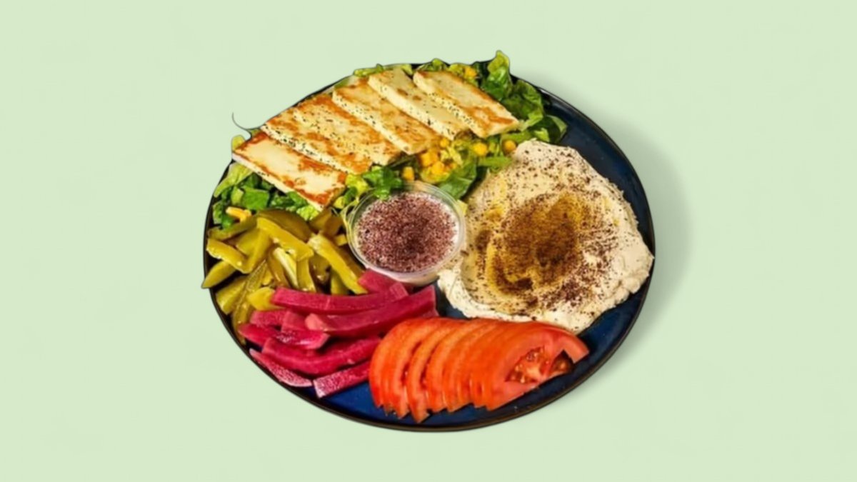 mit gegrillten Halloumistücken, Salat, Tomaten, Gewürzgurken, eingelegter Rote Beete, Hummus und Tahinisoße