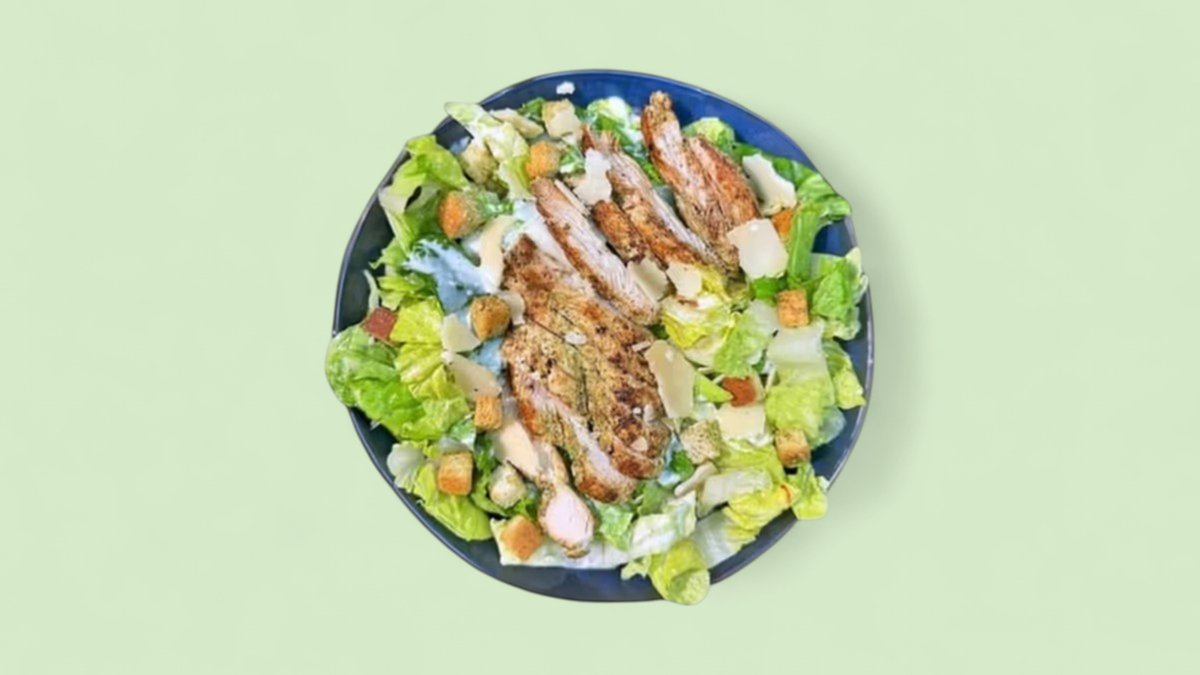 mit Salat, Hähnchen, Cheddar-Soße, Parmesan und Croutons