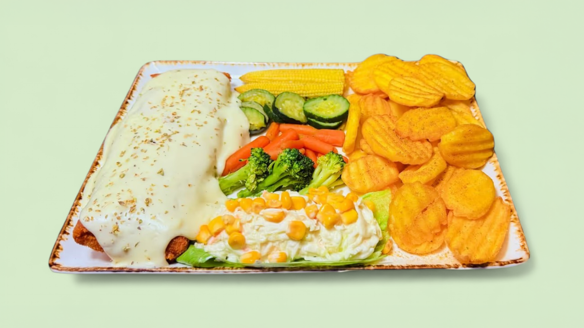 frittierte Hähnchentasche (gefüllt mit Käse und Putenbrust) mit feiner Béchamelsauce wird mit Wellenpommes, Sautéed Gemüse und Colslaw Salat serviert
