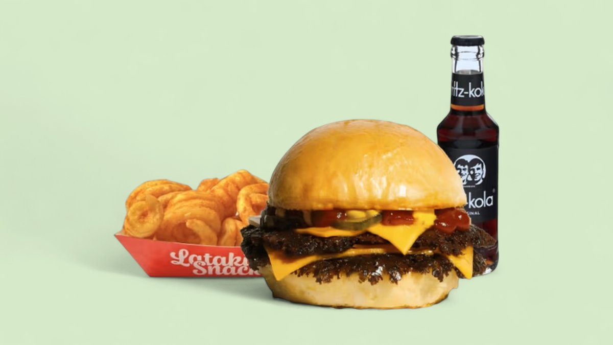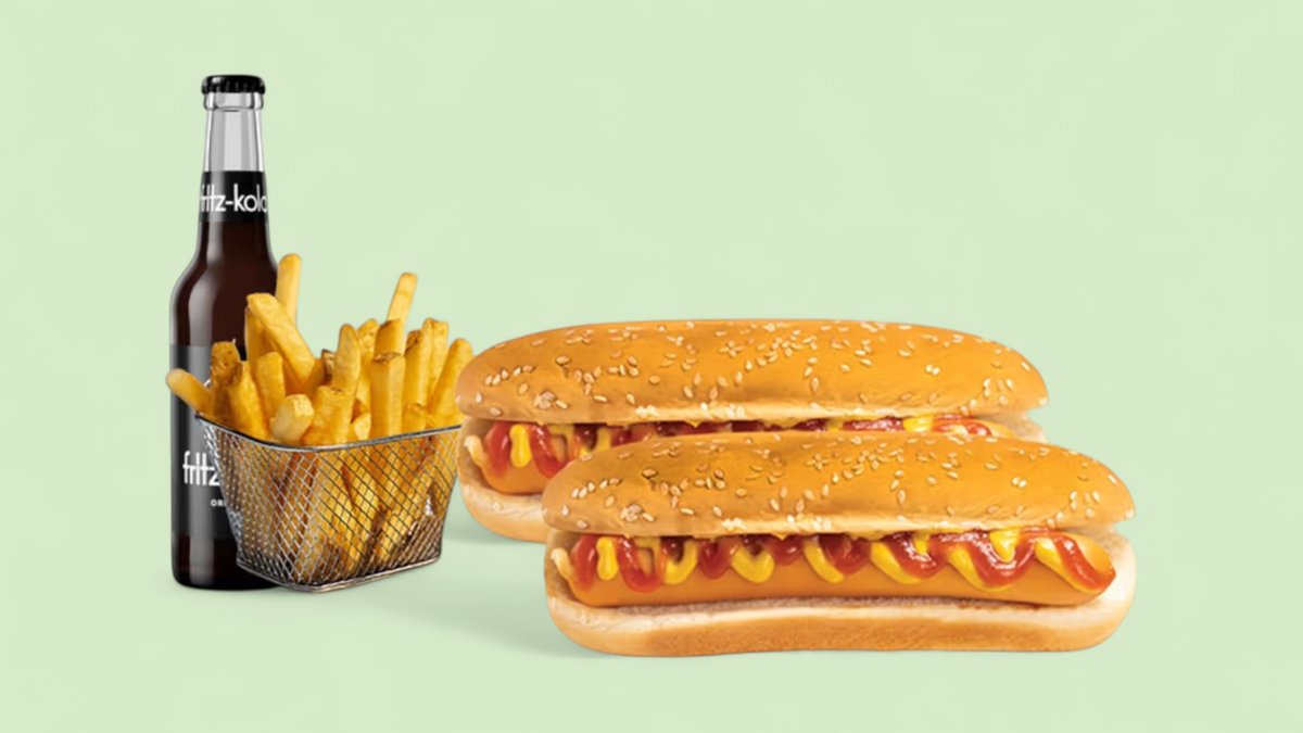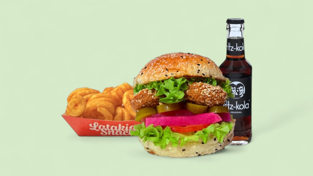 2x Rinder-Patty (halal), Käse, Salat, rote Zwiebeln, Gewürzgurken und Burgersauce. Es wird mit Pommes Frites und ein Getränk serviert.