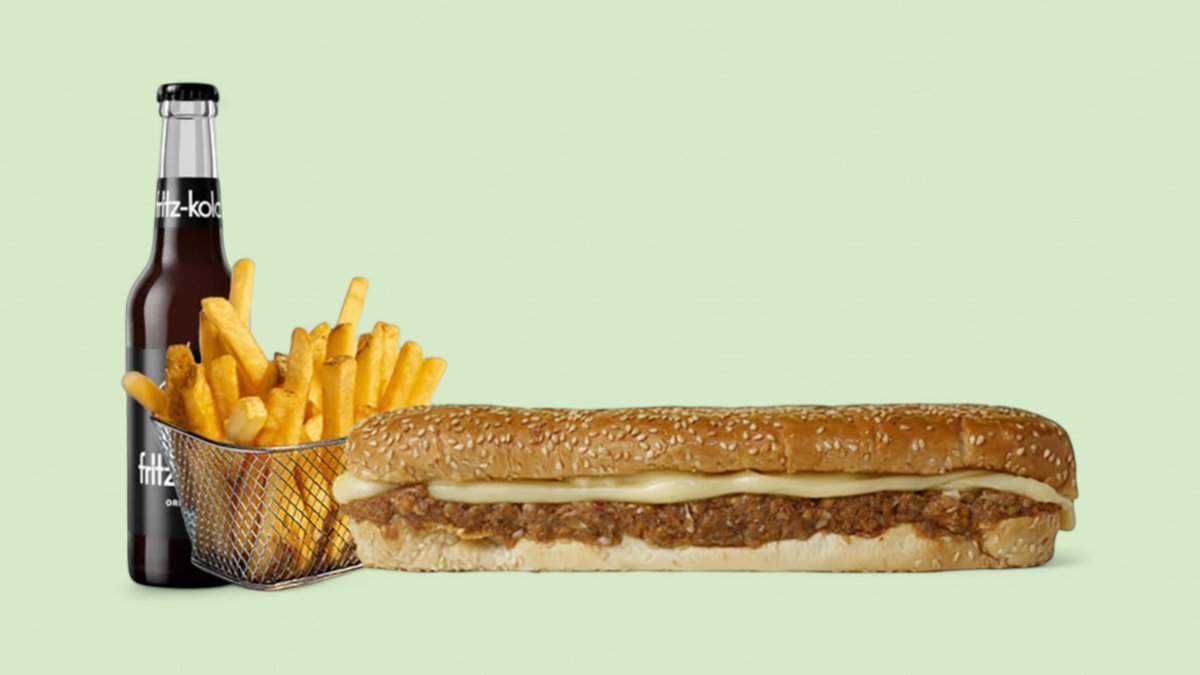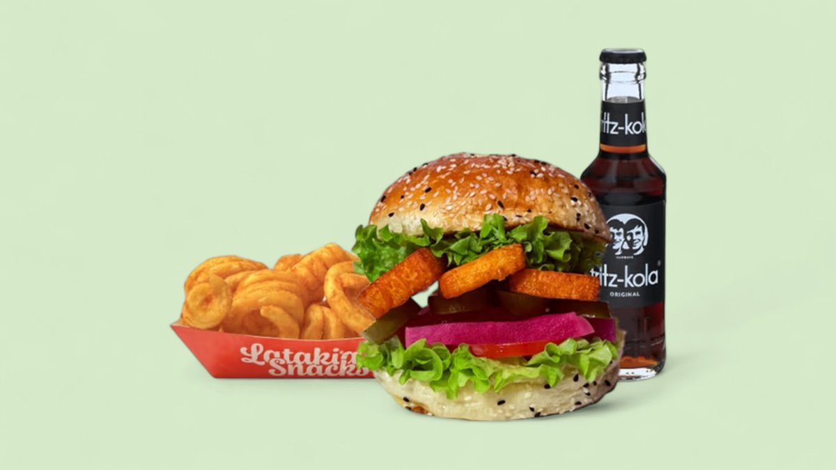 Rinder-Patty (halal), Käse, Salat, rote Zwiebeln, Gewürzgurken und Burgersauce. Es wird mit Pommes Frites und ein Getränk serviert.