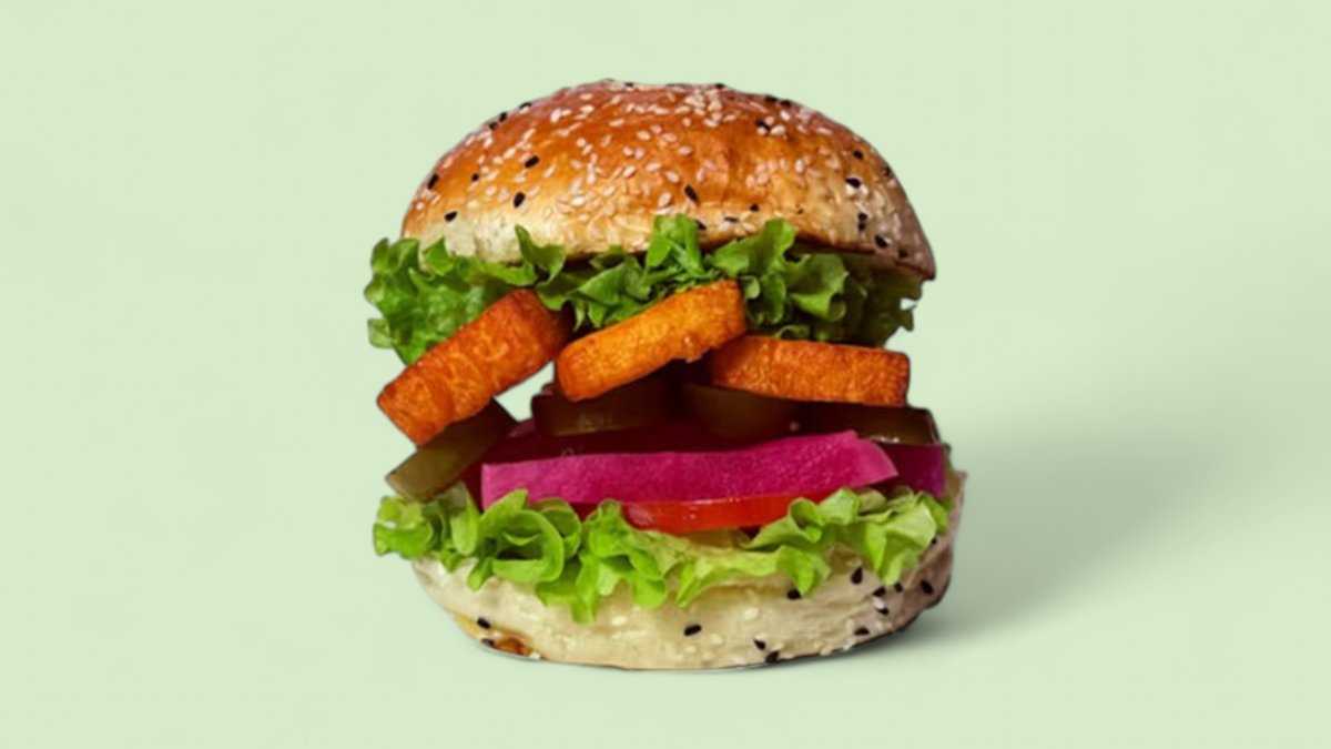 Halloumi, Eisbergsalat, Tomaten, Gewürzgurken und Tahini. Es wird mit Pommes Frites und ein Getränk serviert.