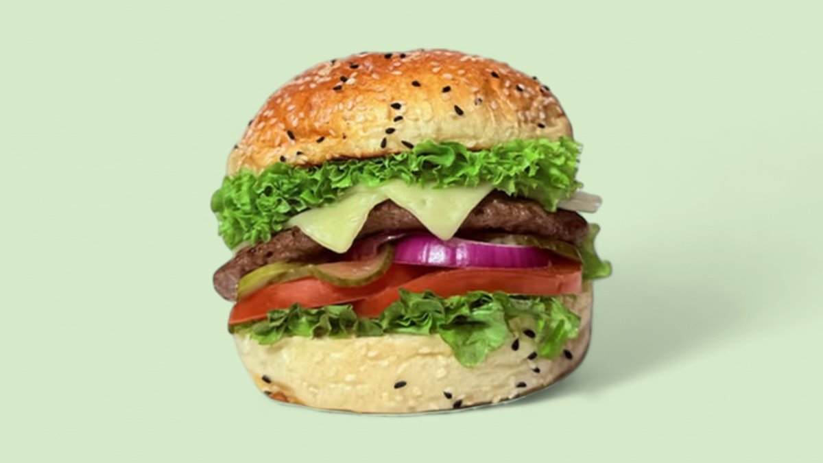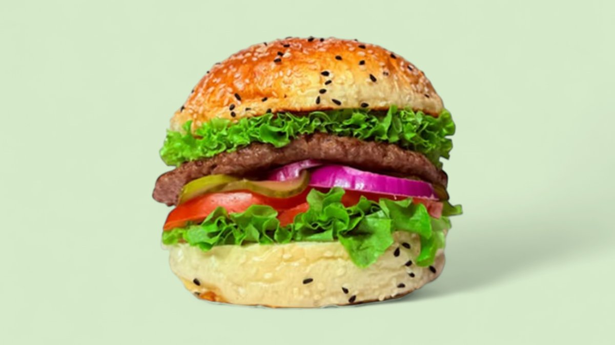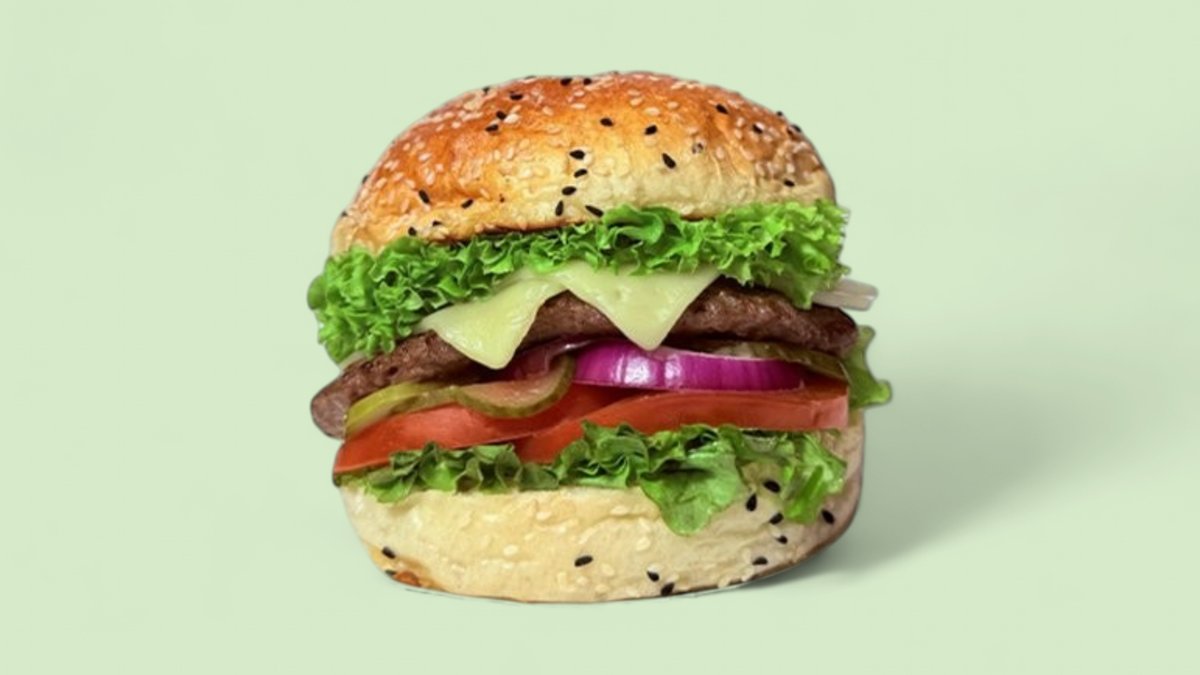 2x Rinder-Patty (halal), Käse, Salat, rote Zwiebeln, Gewürzgurken, Tomaten und Burgersauce