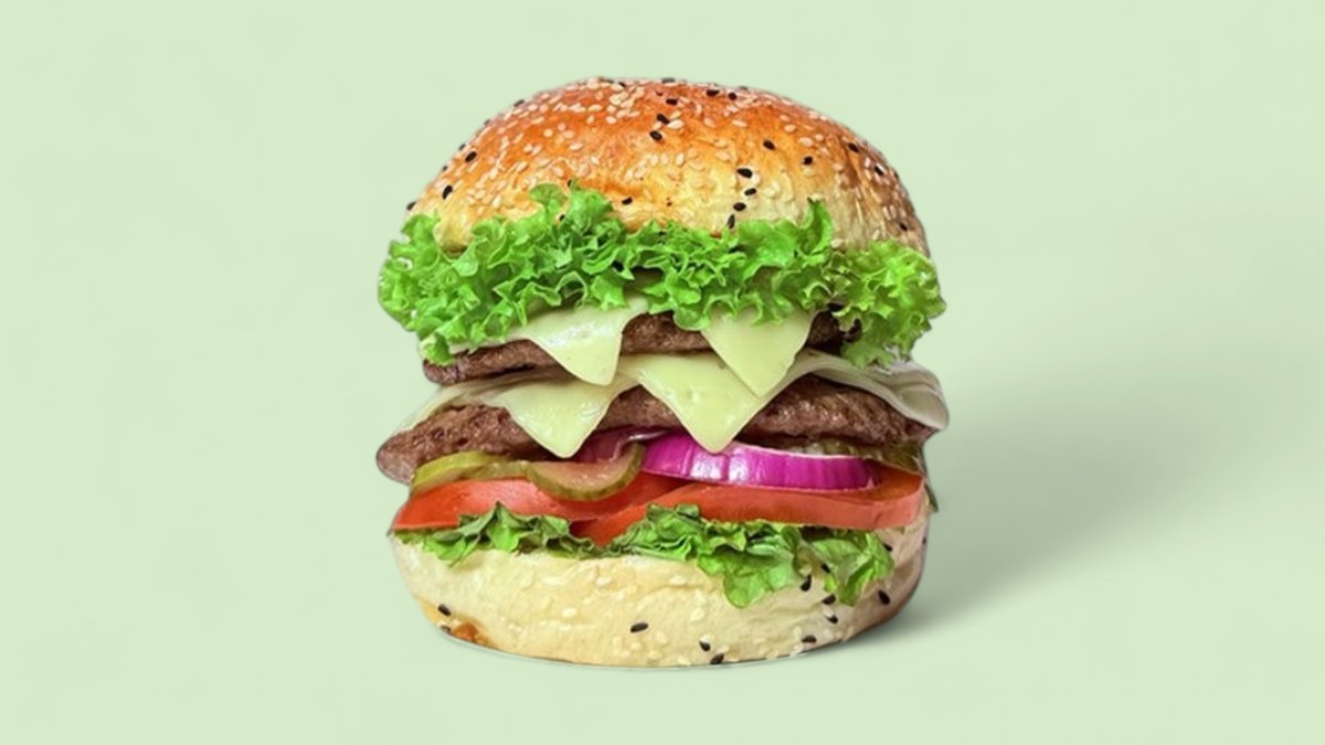 2x Rinder-Patty (halal), Käse, Salat, rote Zwiebeln, Gewürzgurken, Tomaten und Burgersauce. Es wird mit Pommes Frites und ein Getränk serviert.