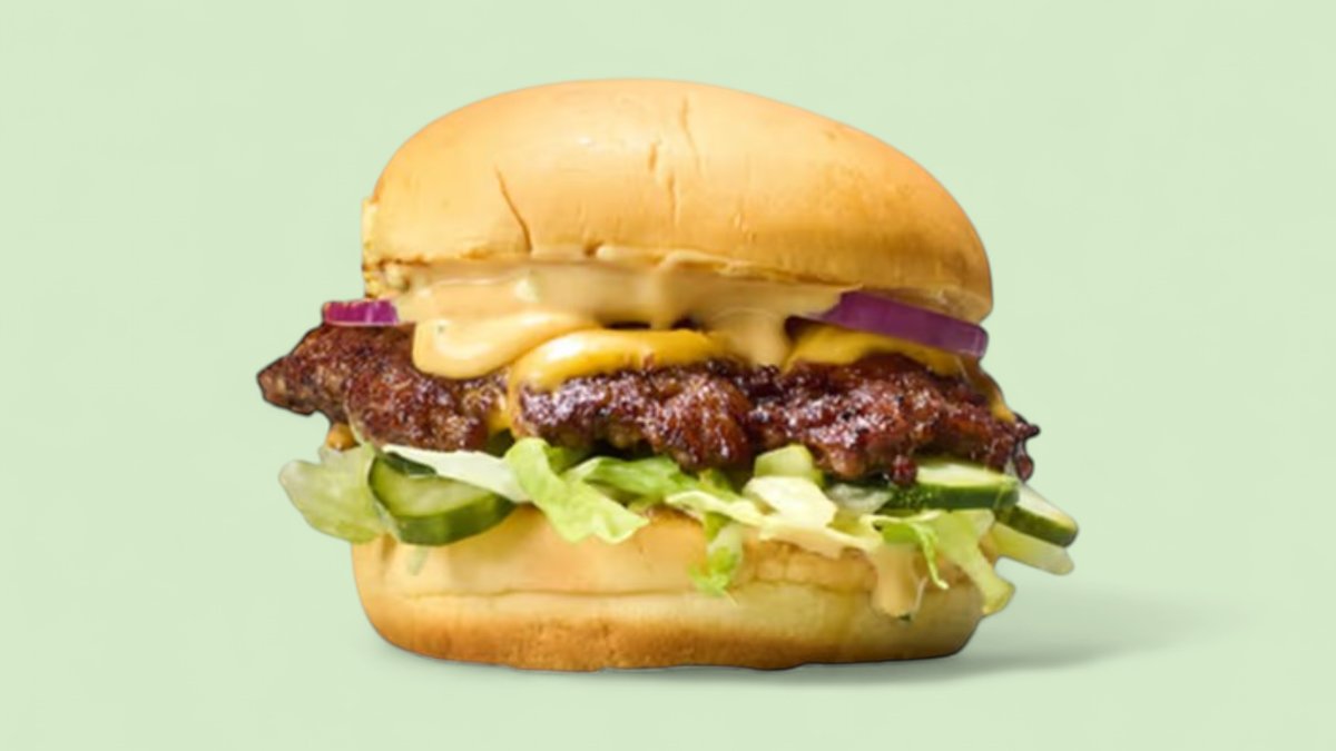 Rinder-Patty (halal), Käse, Salat, rote Zwiebeln, Gewürzgurken und Burgersauce