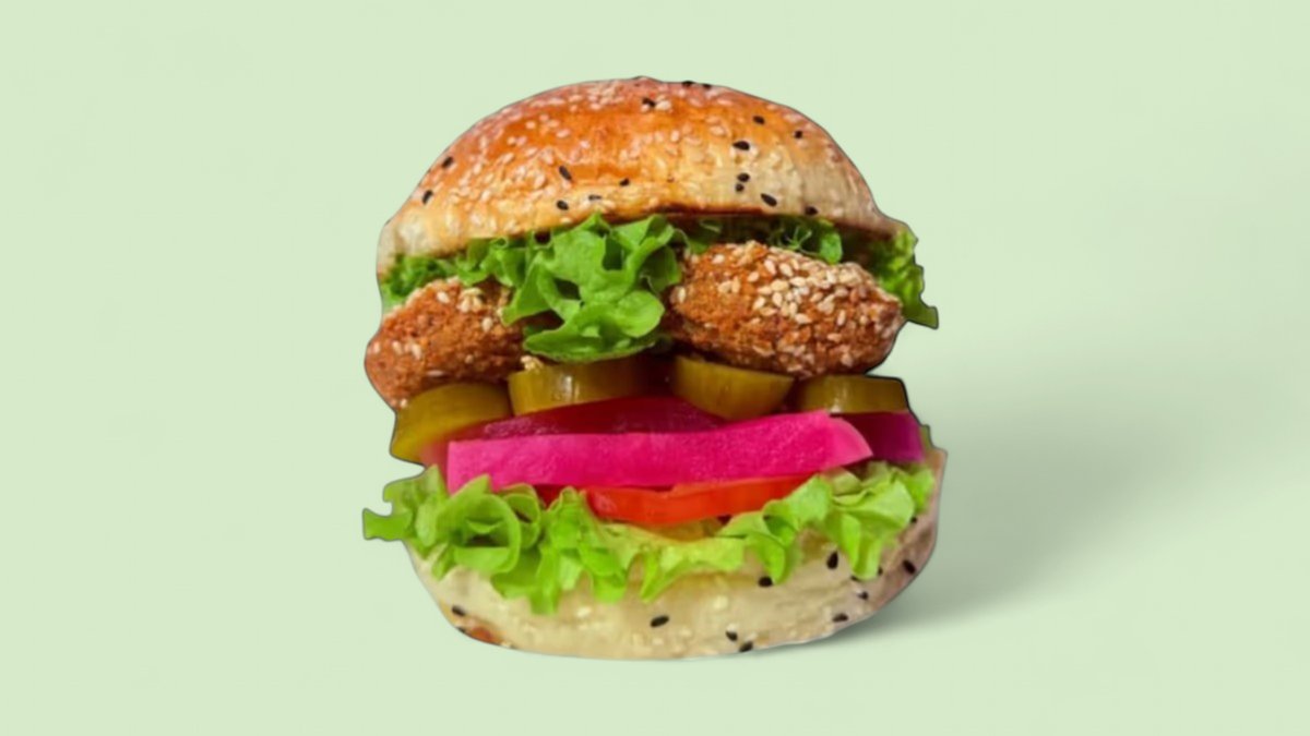 Falafel, Salat, Tomaten, eingelegte Gurken, eingelegte Rüben und Tahini. Es wird mit Pommes Frites und ein Getränk serviert.
