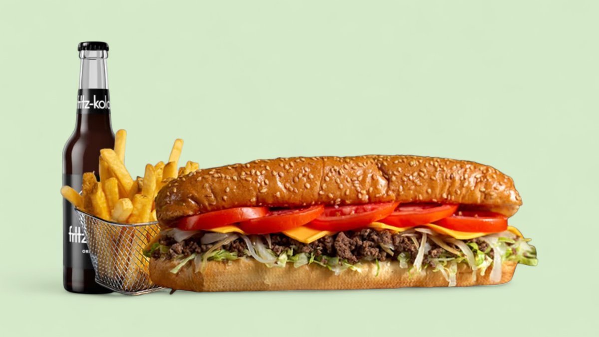 Rinder-Patty (halal), Käse, Salat, rote Zwiebeln, Gewürzgurken, Tomaten, Jalapeno und Burgersauce. Es wird mit Pommes Frites und ein Getränk serviert.