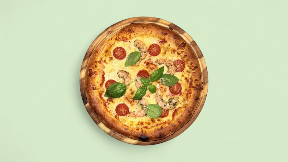 mit italienischer Pizza Soße, Käse, Garnelen, Cherrytomaten und Knoblauch-Olivenöl. Wird mit täglich frischem veganem Teig zubereitet.
